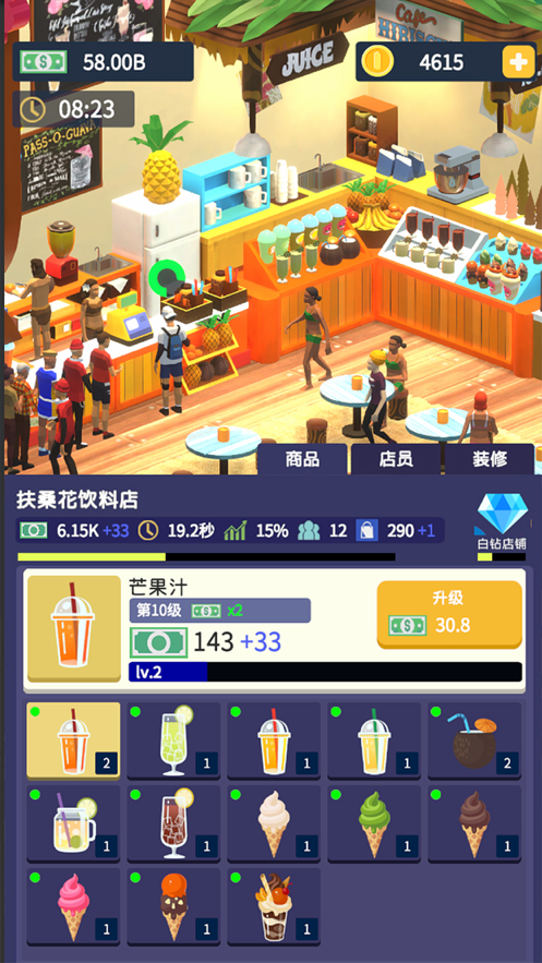 2.升级商店,解锁更多出售的商品,吸引无数顾客消费并赚取丰富的金币。