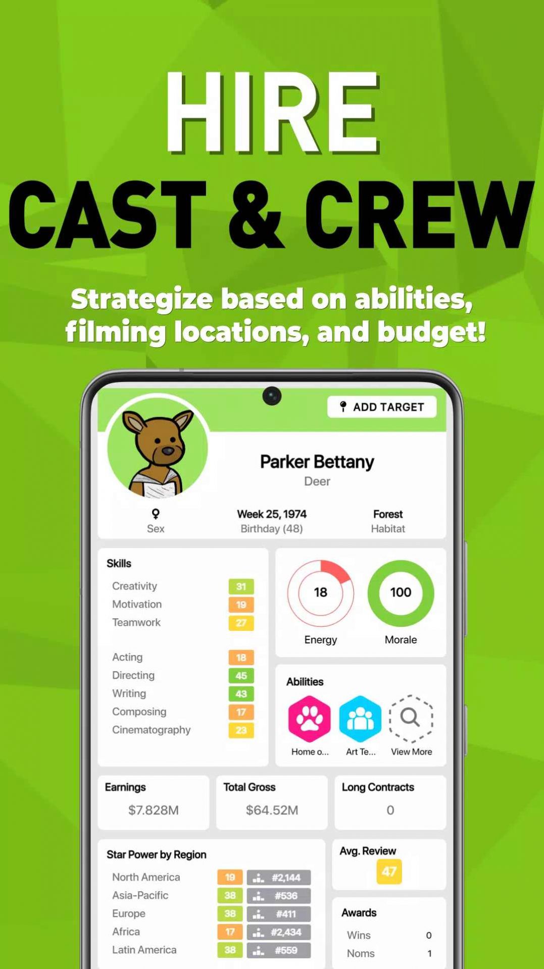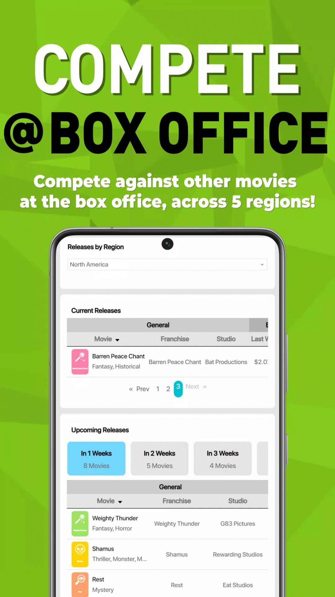 一款在虚拟世界成为电影票房经营者的游戏,扮演电影公司负责人,经营着自己的电影公司,并通过调整影片制作的各个环节,以及投入宣传和市场营销策略来提升自己的票房收入,玩家需要从预算、制作、演员、导演和宣传等诸多方面考虑,并以适时的方式发布电影。从一个小型的独立电影制片厂开始,看看你是否有能力在行列中崛起,成为为数不多的主要电影制片厂之一。