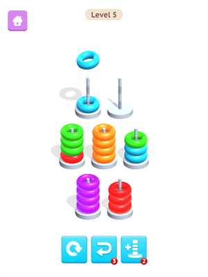 环色拼图是一款简单的休闲游戏。游戏中有许多不同颜色的圆圈,它们被放置在各个桌子上。你的任务是通过移动圆圈的方式,将相同颜色的圆圈放在一起。每个关卡的柱子数量都不同,随着柱子数量增加,游戏的难度也会增加。这款游戏设计得不会让人感到无聊,给玩家带来娱乐。