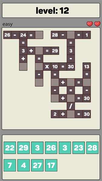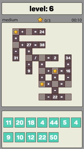 数学十字数谜题(Math Cross Number Puzzle),一款有助于开发大脑,增强数字的敏感度的闯关小游戏。该游戏关卡十分丰富,整体男宿还是很高的。游戏中玩家需要激发你的数学天赋,仔细观察关卡中的数字,完成内容填空。每一局游戏都会有一定的时间限制,玩家需要击中注意力,在规定时间内完成通关任务,解锁新的游戏内容。