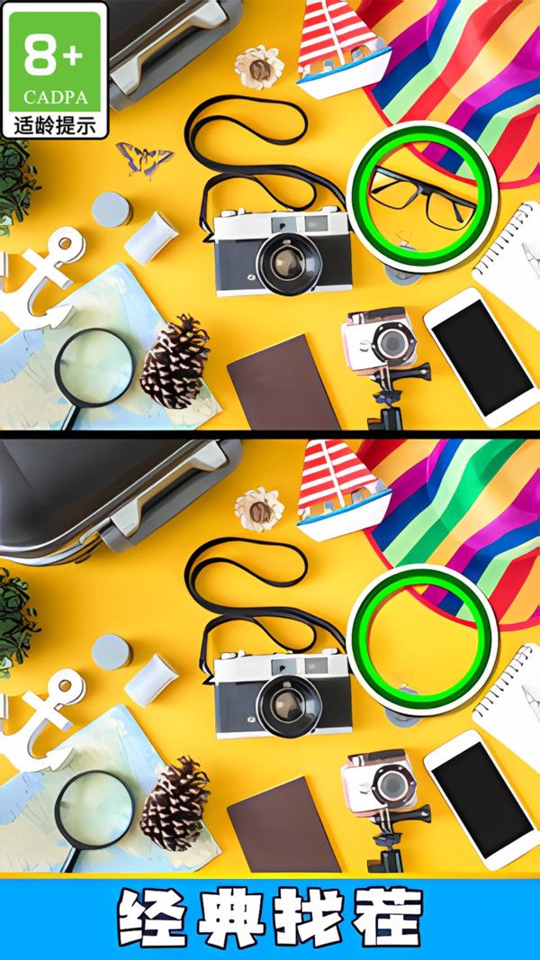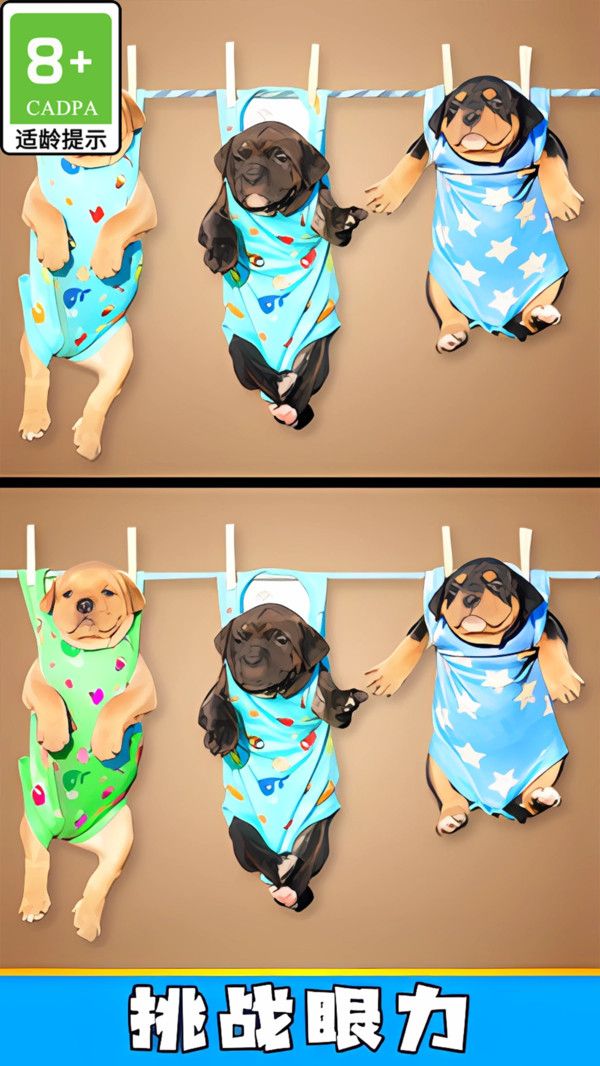 2、简单的操作,通过仔细的观察出两幅相似图片的不同就能过关。