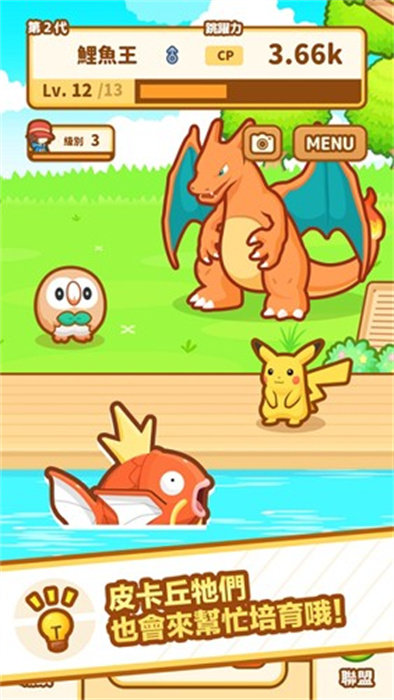 2、游戏中引入了宝可梦的元素,可以邀请自己喜欢的宝可梦角色来帮助自己照顾鲤鱼王。