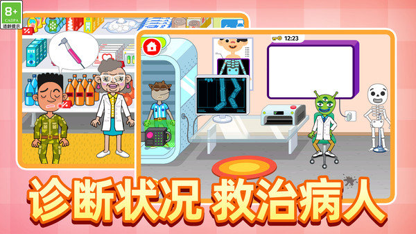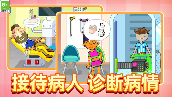 1、丰富的病人等待诊断和救治,考验玩家的判断力和决策力。卡通画风和可爱的角色,营造轻松活泼的氛围,让玩家沉浸在游戏中。