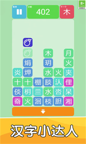汉字小达人是一款汉字题材的休闲闯关的游戏,整个游戏使用的是类似俄罗斯方块的玩法,会有很多的汉字不断下落,玩家要做的就是控制汉字落下的位置,当下落的汉字方块可以与其他汉字组成新的汉字时就能够完成闯关挑战。整个游戏玩起来也是很简单的,只需要点击屏幕就可以,心动的话就来入手吧。汉字小达人说明