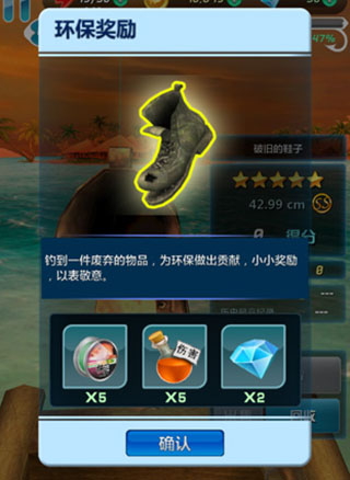 良好的运气也是实力的体现,《全民钓鱼》中偶尔会有稀有物品的出现。上钩了!激烈的搏斗,猛烈的挣扎,好!钓上来了!是破靴子!破靴子?对,不要失望,其实这也是稀有物品的一种,虽然不是大鱼,却为环保做贡献,可以换来大量钻石、属性药水甚至高级钓具!如此惊喜,简直爽翻了!