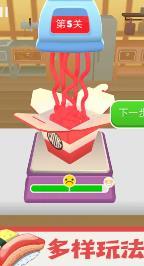 美味美食小屋是一款模拟经营与烹饪技巧相结合的益智游戏,你要在游戏中扮演一名寿司师傅,不断去完成更多的寿司任务来解锁各种食材、工具。从基本的切割到超级复杂的烹饪技巧,要不断提升自己的料理技巧,还有更多的关卡任务等你来挑战!