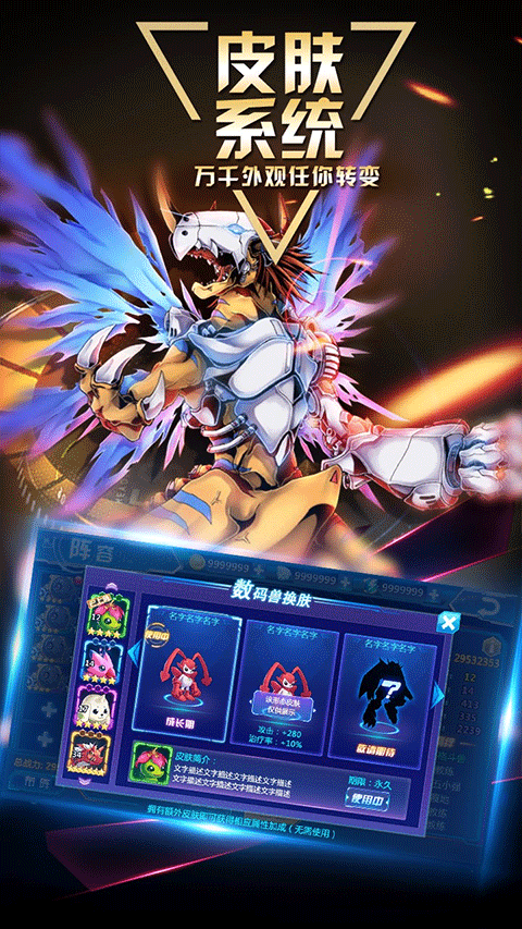 装备系统:玩家可以为数码宝贝装备各种武器、防具、饰品等装备,提升其属性和战斗力。装备可以通过副本掉落、商店购买、任务奖励等方式获取,还能进行强化、精炼、镶嵌宝石等操作,进一步提升装备的品质和属性。