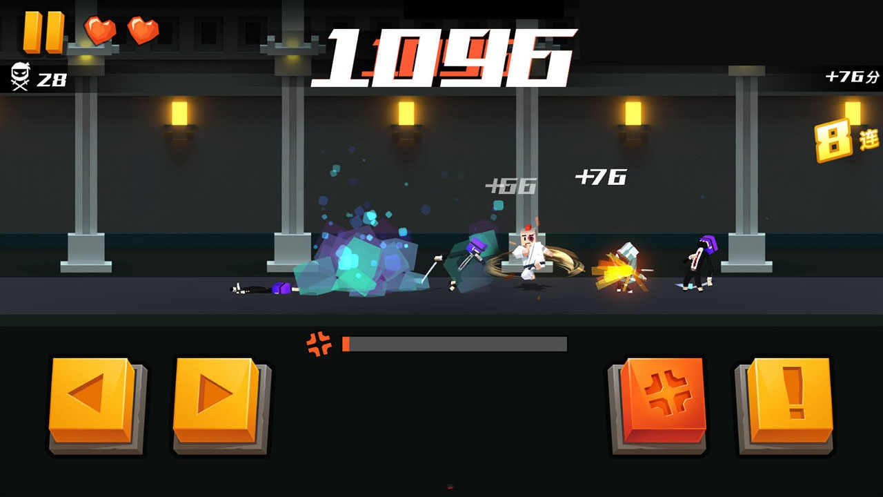 【空手接白刃】空手接白刃是一款战斗非常激烈的动作游戏,游戏中,玩家不能直接攻击对手,需要以招架反击的方式反弹对手的攻击,间接给对手造成伤害,场景中会不断生成敌人,玩家需要尽快消灭场上存活的敌人,避免积累被敌人围殴,在与敌人不断战斗的过程中,玩家还能学会各种特殊的招架动作,可以招架来自不同方向的攻击。空手接白刃特色
