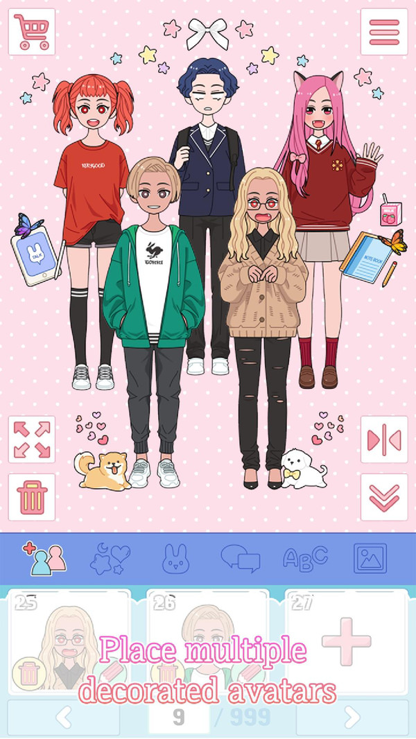 2.来应用很多衣服裤子,物件,视频语音汽泡和英文字母装饰设计你可爱的女生。