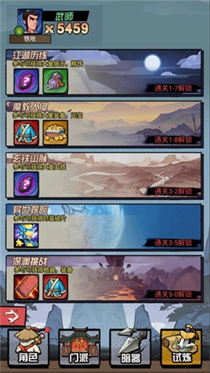 解锁新的侠客进行修行是可以带来更多新的玩法模式,以推图闯关收集天下奇珍暗器和学习天下武功为主要玩法