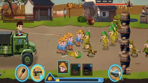 鬼子进村是一款非常好玩的休闲横版闯关类手机游戏,敌人来袭,玩家需要拿起自己手中的武器进行对抗,村里的乡亲们已经奋战在了第一线,你可以使用各种高科技武器对敌军发起突袭,减缓敌人的攻势,甚至是将敌人们一次性消灭,关卡多多,积攒金币,解锁更多民兵造型,快来下载吧。