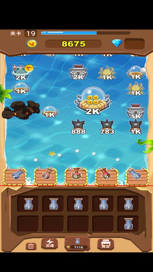 游戏采用了合并和射击结合的玩法。在消灭海盗中,玩家可以利用自己的火炮去轰炸袭来的海盗船。当你成功完成游戏布置任务,你就可以解锁火炮,当你收集到3门相同的火炮的时候你就可以合并这些火炮令火炮升级。升级过后的火炮拥有更加强大的火力,更远的射程。游戏的关卡比较丰富,可以供玩家挑战许久。