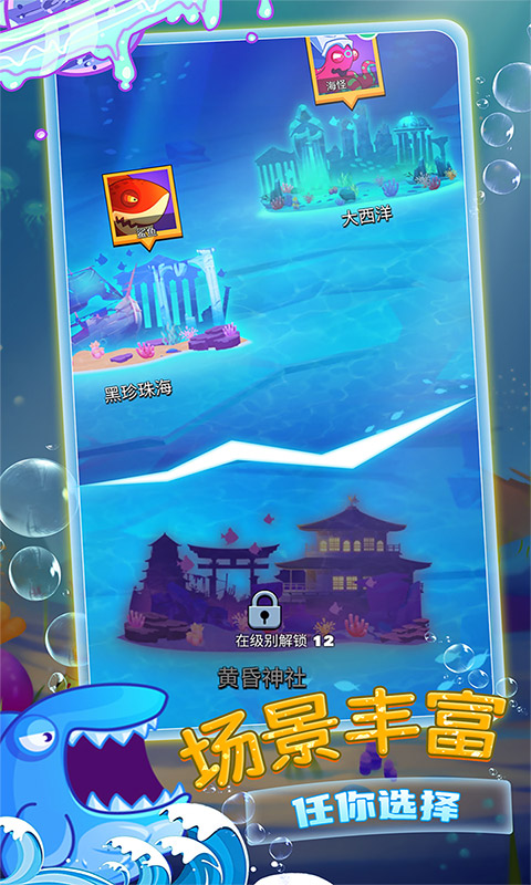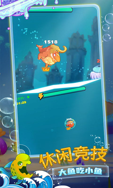 1、鱼进化卡通风格的海底世界,自由吞噬发展,不断成长,获得更刺激的游戏体验。