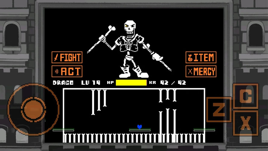 战斗方框:如果敌人选择攻击你(不论你是否选择主动攻击),在屏幕下方会出现一个方框,玩家操控这个心形对方框的图案进行躲避,一旦被触碰就会受到伤害,某类特殊图案即便是触碰了也不会受到伤害(如骷髅的蓝光)。
