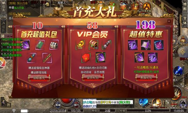 创建职业后,下一步就是选择合适的首充价格。必须注意是否有活动,首次充值若有赠品,则第一次充值可选择适当的额度,可获得最多的赠品。充值后第一天即开始购买月卡,享受月卡每日绑定元宝及道具福利。