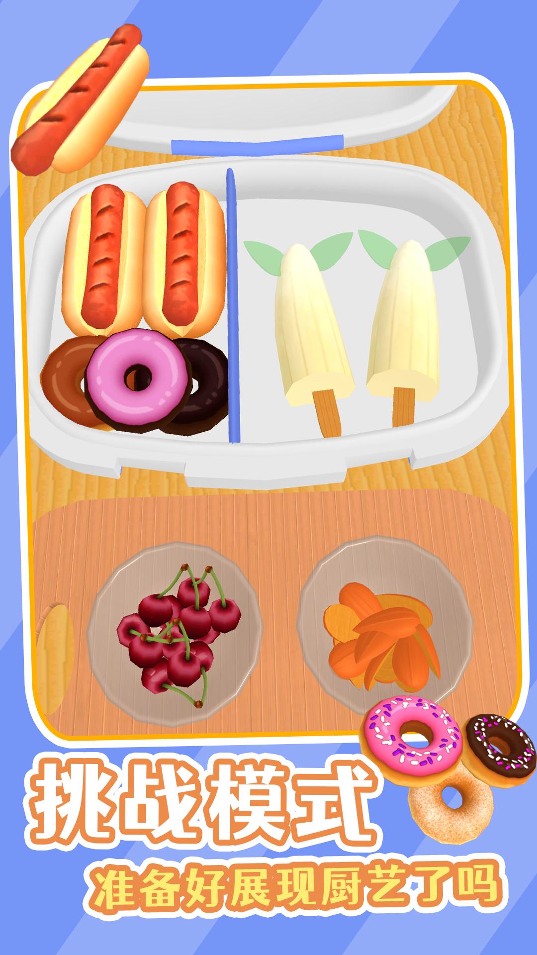1、开始欢乐的做菜挑战,这里有很多的料理可以烹饪,快速准备好自己的便当吧。