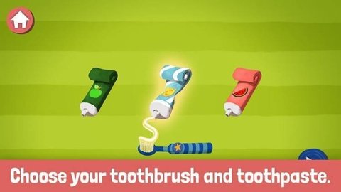 2.给你选择的动物朋友喂蔬菜、水果或糖果,看着它们的牙齿越来越脏,然后选择一把有趣的牙刷和一支色彩鲜艳的牙膏;