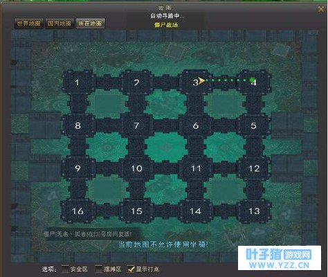 僵尸战场的地图分为16个房间。 僵尸战场道具: (1)每个房间都会随机刷新的道具,有攻击符、防御符、治疗符、打散符,隐身符。 1、打散符:打散敌人队友到任意房间、 2、传送符:随机传送自己到任意房 3、隐身符:就是自己隐身咯。 4、神秘符:就像它的名字,我也不知道会变成什么符咒。 5、攻击、防御、治疗 就不解释了。这个大家都知道的。