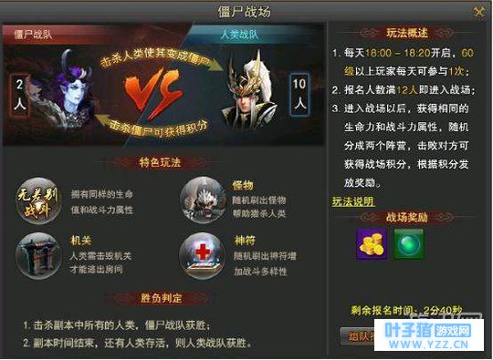进入战场以后不论是组队报名还是单人报名,都会被系统随机分成两个战队——2人的僵尸战队和10的人类战队,。