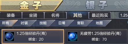多倍经验 《西楚霸王》在多种日常活动中投放了多倍经验状态,帮助玩家更加快速地提升等级; 同时,商城中也投放了多倍经验丹,用于提升玩家打怪时获取的经验。 经验丹 经验丹主要分为2种: 1、 普通1.25倍经验丹可用于疲劳前打怪获取经验。 2、 无疲劳1.25倍经验丹可用于疲劳后打怪获取经验。 经验丹投放 主要投放在绑金商城和威望商城: 家族宴会 参加完家族宴会的玩家,将获得一个持续2小时的经验加成状态(状态加成的经验数值与家族宴会所用的道具品质相关)。