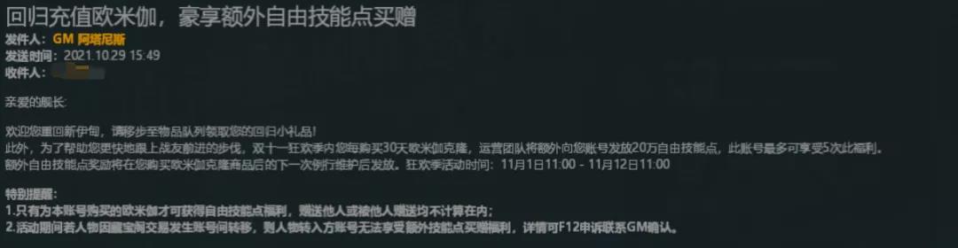 从零体验另一个颠覆的EVE宇宙!《星战前夜:晨曦》先锋测试将至! 参加问卷获取测试资格>> EVE官方双十一五大狂欢季活动来啦!!! 尊敬的舰长: 11月1日例行维护后,新伊甸双十一系列活动即将开启,活动详情如下: 活动一:舰长回归赠好礼 活动时间:11月1日11:00 - 11月12日11:00 活动详情:活动时间内,符合特定回归条件的玩家账号(以账号内游戏人物收到的GM邮件为准)登录即可领取审判者级星际网络直播分部稀有涂装一份。 邮件示例: 活动二:回归充值欧米伽 豪享额外自由技能点买赠 活动时间:11月1日11:00 - 11月12日11:00 活动详情:活动时间内,符合特定回归条件的玩家账号(以账号内游戏人物收到的GM邮件为准)每购买30天欧米伽克隆,运营团队将额外向账号发放20万自由技能点。额外自由技能点奖励将在购买欧米伽克隆商品后的下一次例行维护后发放。 备注: 1.只有为本账号购买的欧米伽才可获得自由技能点福利,赠送他人或被他人赠送均不计算在内; 2.活动期间若人物因藏宝阁交易发生账号间转移,则人物转入方账号无法享受额外技能点买赠,详情可F12申诉联系GM确认。 活动三:争夺每日最高价值击坠KM 冠军豪享360天欧米伽克隆尊享礼包 活动时间:11月2日11:00-11月8日11:00 活动详情:活动时间内,每天(例行维护结束至次日维护开始)按损毁总价值排序统计出的最高价值的3个玩家击杀舰船KM,最后一击玩家可获得以下奖励: 冠军:本期360天欧米伽克隆尊享礼包中的所有内容 亚军:欧米伽克隆90天 季军:欧米伽克隆30天 备注: 1.发生在高安等星系的KM不会被算入统计范围内。 2.损毁总价值仅以游戏内KM上显示的“总价值”为准,因异常因素导致总价值畸高的KM在官方核实后不会被算入统计范围内。 3.每日战报排行榜翌日维护后可在官网页面查询,所有奖励发放时间为11月9日例行维护后。 4.每日战报中若出现总价值完全相同的KM,则以击坠时间发生较早的KM为获胜者。 5.若奖励发放时冠军玩家账号已购买当季360天欧米伽克隆尊享礼包,则改为发放等价伊甸币(5160个)。 6.若符合统计要求,同个账号可领取多次奖励。 7.活动最终结果以官网发布为准。 活动四:狙击高价值击坠KM 乐享限量试验型信号-50“挺针”纤维 活动时间:11月4日11:00-11月10日11:00 活动详情:活动时间内,每天(例行维护结束至次日维护开始)按损毁总价值排序统计出的最高价值的50个玩家击杀舰船KM,每个KM的最后一击玩家人物可获得试验型信号-50“挺针”纤维 X2。每天限量发放100个,共计600个。 备注: 1.发生在高安等星系的KM不会被算入统计范围内。 2.损毁总价值仅以游戏内KM上显示的“总价值”为准,因异常因素导致总价值畸高的KM在官方核实后不会被算入统计范围内。 3.每日战报排行榜翌日维护后可在官网页面查询,纤维将于翌日维护后12:00发放。 4.若符合统计要求,同个账号可领取多次奖励。 5.活动最终结果以官网发布为准。 活动五:深渊竞速火热再临 元帅级等你来赢 活动时间:11月11日11:00-11月18日11:00 活动详情:敬请期待! 《超激斗梦境》2月新服冲级领月卡!加群享礼包、充值返现等福利,戳此一键加入>>> |