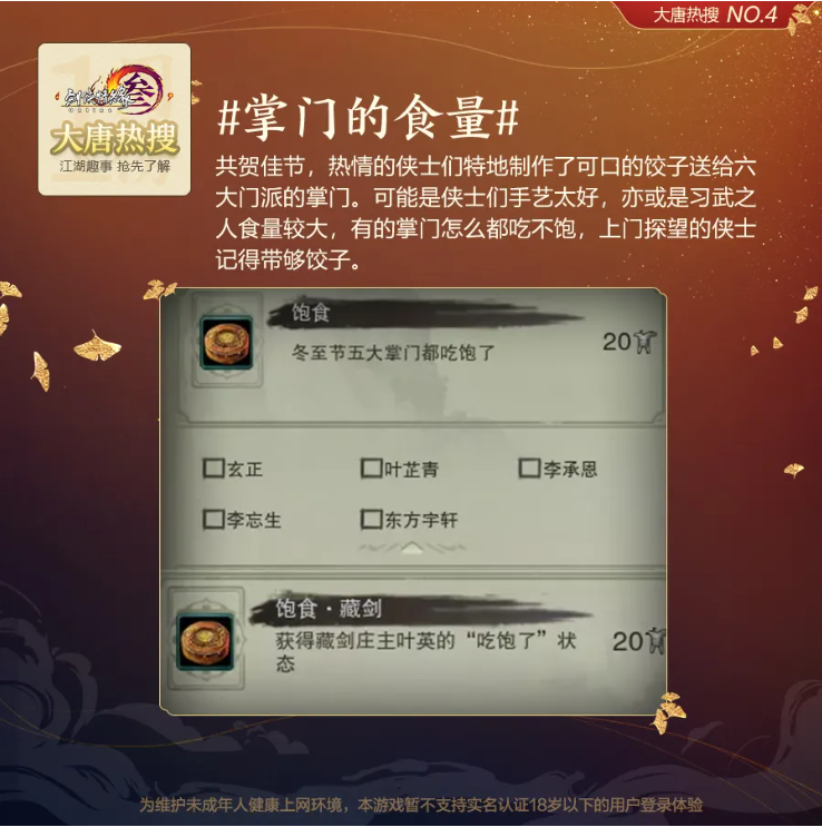临近春节,《剑网3》怀旧服节日气氛越发浓厚,官方整理出了一份大唐热搜榜单,今天就带大家一起来看看,到底有哪些热点是玩家最关心的! 热搜第一 #牛牛的新年金蛋# 这个是“牛牛的最后一击”金蛋活动,在活动时间里,每天完成一次赏金任务就能额外获得一枚金蛋,最多能获取5个金蛋。 金蛋打开有五行石、福禄宝箱甚至月卡,看到月卡大家都是两眼冒光,纷纷表示一定要成为那个拿到月卡的欧洲人! 然而现实总是残酷的,攒五个一起开,全是4级五行石,已经成为一种普遍现象,正如玩家所说的,既然都是五行石那也没什么好说的,大家一起做“非洲人”,不过有人回复总是有人能拿到月卡和宝箱的,只不过不是你我罢了。好家伙,真扎心了! 热搜第二 #镇派上限解锁# 这是关于减负的一些改动,镇派上限解锁的同时,还有剑鸣跟荻花套装属性共享,PVP装备焕新更换,帮会天工等级下调,镇派改动后每个心法可拥有4套镇派,双心法可拥有8套镇派。 不过玩家也在纠结,切换镇派需要消耗修改为,那么单心法打副本要准备一套镇派,野外也要准备一套镇派,同一心法下,要不要切换镇派?一个点的差异是300修为,同一心法下切一次消耗几千修为,肯定会让纳元丹大幅涨价。 热搜第四 #掌门的食量# 在这么多话题里,相信应该有小伙伴对“掌门的食量”这个话题很好奇吧!六大门派的掌门,到底有多能吃?谁又是最能吃的那一位? 少林掌门玄正的食量惊人,一个出家人已下载要吃掉13盒、22盒饺子,甚至还有人喂了53盒才吃饱,难道说平时弟子都不给方丈吃饱饭吗? 要说干饭还得看李承恩李大将军,凭借一己之力把玩家吃穷,可能也只有他能做到了,有玩家哭诉:三个号喂不饱他一个人。真不愧是当兵的! 叶庄主表现出的食量也是大胃王级别的,有玩家计算了一下自己喂给老五门掌门的饺子还没叶英一个人多。到底是藏剑山庄没落了连庄主都饿肚子,还是这叶庄主实在太能吃了? 根据小道消息,身材姣好的叶美人和修仙的东方谷主食量也是相当惊人,不得不说这些掌门也太能吃了。 以上就是“辞旧迎新 金蛋送福”大唐热搜榜的相关内容了,目前新年活动正在逐步解锁,包括大唐腊八节、新增秘境挑战、侠义装备兑换等,大家可以留意一下。那么,今天大唐热搜榜哪一个话题你最感兴趣呢? |