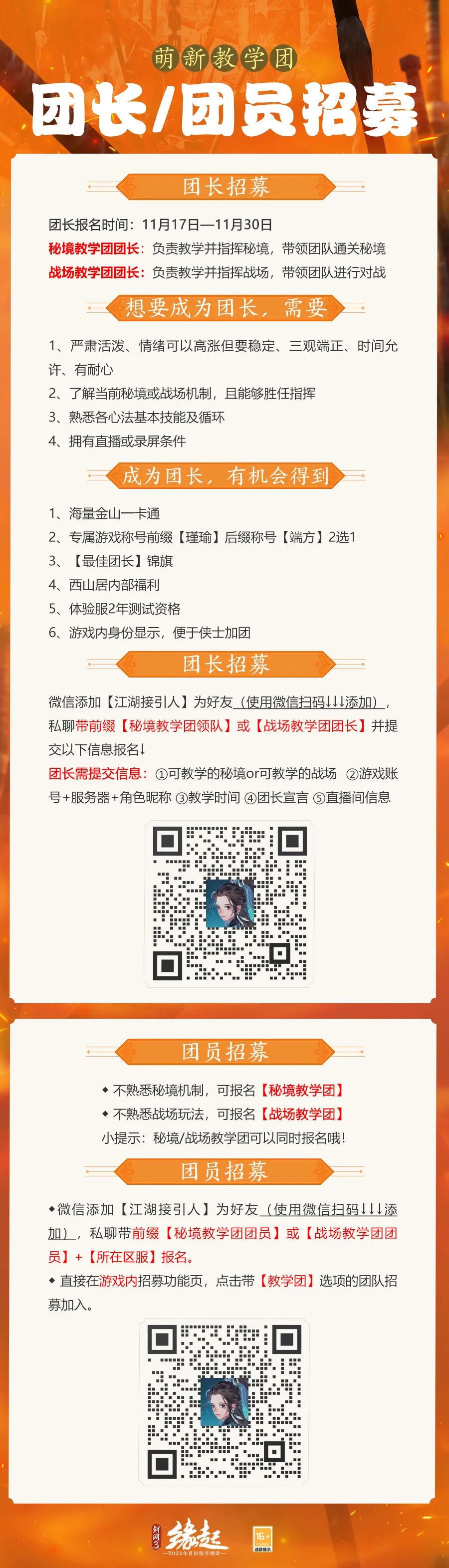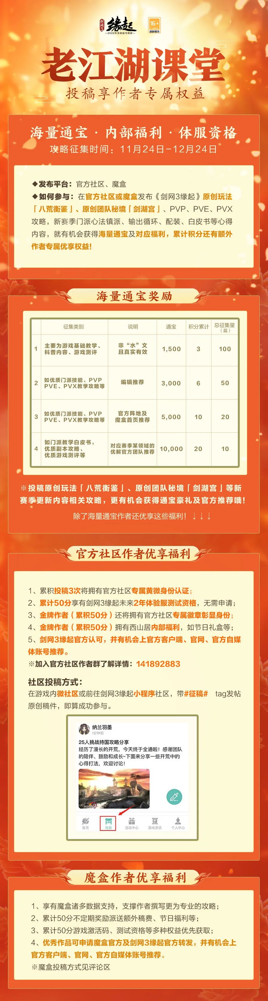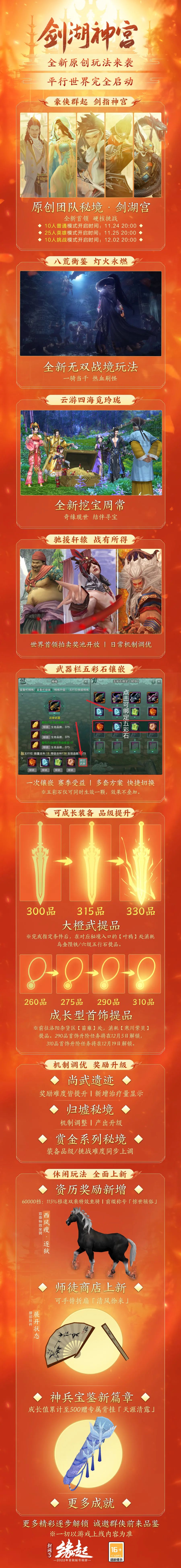 《剑网3缘起》昨日更新了新赛季“剑湖神宫”,同时给我们带来了众多新玩法新活动。由于更新的活动内容及奖励比较多,今天就带大家理清一下更新的核心内容!各位少侠走过路过莫错过~ ※八重活动:永久珍稀腰挂/背挂、限时坐骑登录就送,体验更新内容必得寒川紫贝、天工秘宝等江湖好物 ※行侠令奖励焕新:双倍寒川紫贝免费送;更有华丽外装/绝美头像框/表情包待侠士解锁 ※探索剑湖宫:携友探秘必得专属称号「仙影」/武器盒子/寒川紫贝,更有万元豪礼/珍稀背挂/限时里飞沙等你来拿! ※剑湖神宫征集令:分享「八荒衡鉴」通关展示技能组合/新内容趣味体验截图、投稿同人作品,瓜分10000元豪华奖池 ※老江湖课堂攻略征集:官方社区或魔盒发布新玩法心得内容,就有机会获得海量通宝及对应福利 ※招募开启帮扶萌新:萌新教学团/游侠导师团招募持续进行中 新赛季更新内容 新赛季团队秘境“剑湖宫”逐步开启,无双战境“八荒衡鉴”破关重重四海名扬......多项玩法全面上新,机制调优奖励升级。更多精彩逐步解锁,诚邀群侠前来品鉴! 公测献礼 八重活动闯荡无忧 八重诚意活动助力侠士闯荡无忧。永久珍稀腰挂/背挂、限时坐骑登录就送,体验更新内容必得寒川紫贝、天工秘宝等江湖好物,更有萌新增益助力成长! 行侠令奖励焕新来袭 行侠令携豪礼焕新来袭,双倍寒川紫贝免费送!升级“豪侠令”后更有华丽外装「夜阑风雨」、飒爽江湖劲装「短夜长·一」、绝美头像框「像韵·吟寒」、表情包「虎小白2.0」待侠士解锁! 探索剑湖宫 「探索剑湖宫」H5活动今日上线,邀请亲友一同探秘并收集剑湖宫首领情报,必得专属称号「仙影」/武器盒子/寒川紫贝等好礼,更有万元豪礼/珍稀背挂/限时里飞沙等你来拿! 活动时间:11月24日14:00-12月8日7:00 参与方式: Step1:扫码参与活动 Step2:邀请亲友助力增加探索次数,进行探索获取限定称号及剑湖宫秘宝;可将自己拥有的首领情报赠送给亲友或接受亲友的赠送。 Step3:同时可邀请亲友回归,共闯江湖,获取寒川紫贝及武器盒子。 活动须知: 1. 活动期间,每个身份证下仅限一个金山通证/WeGame账号参与活动。账号登录后,不可再修改为其他账号。 2. 活动可在微信、QQ两个平台参与;各平台信息不互通。账号登录后,不可再更换到其他平台参与活动。 征集招募 剑湖神宫征集令 11月24日-12月1日,分享「八荒衡鉴」通关展示技能组合/新内容趣味体验截图、投稿同人作品,便有机会瓜分10000元豪华奖池,获得剑歌江湖音乐专辑精装版、GSC-穆玄英/叶英、缘起限定实物周边等豪礼,加入共创者,更可获得额外权益专属加赠! 老江湖课堂攻略征集 11月24日-12月24日,在官方社区或魔盒发布新赛季PVP、PVE、PVX攻略,原创秘境“剑湖宫”、全新玩法“八荒衡鉴”等心得内容,就有机会获得海量通宝及对应福利,累计积分还有额外作者专属优享权益! 招募开启 大侠帮扶萌新 为助萌新更快融入大美江湖,萌新教学团/游侠导师团招募持续进行中!感兴趣的侠士们快扫码报名,一起畅游江湖吧! 以上是今日带给大家的全部内容!希望能帮到大家!更多《剑网3缘起》相关资讯,可以关注叶子猪的《剑网3缘起》官方合作专区 |
