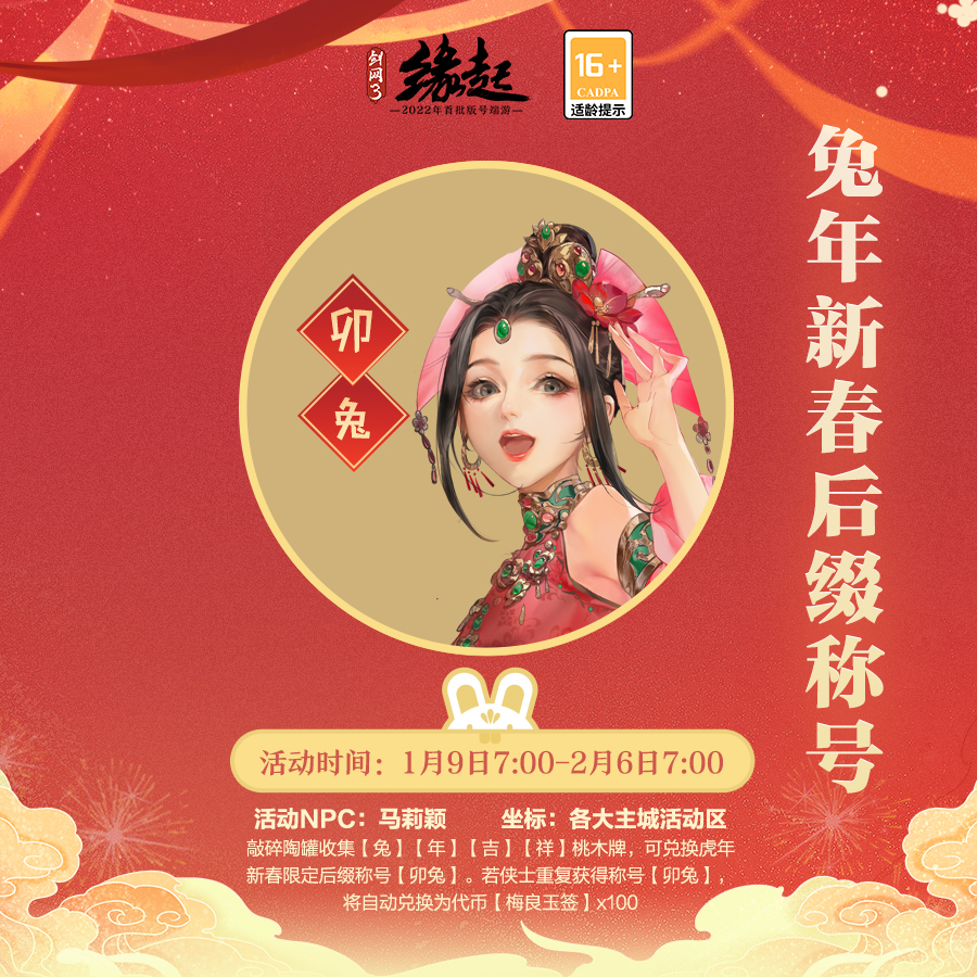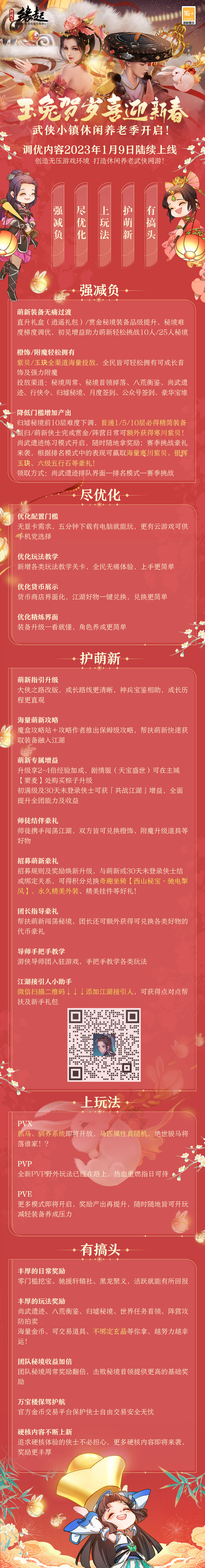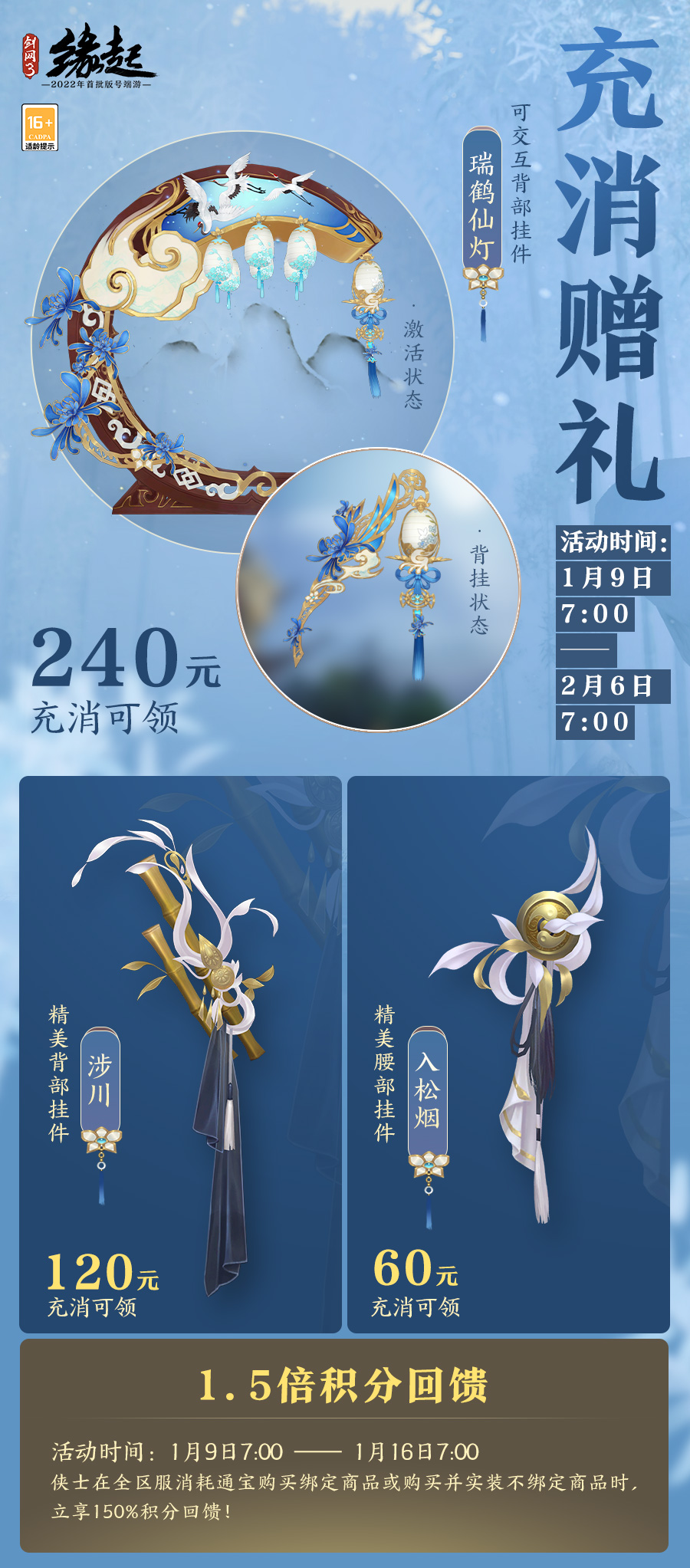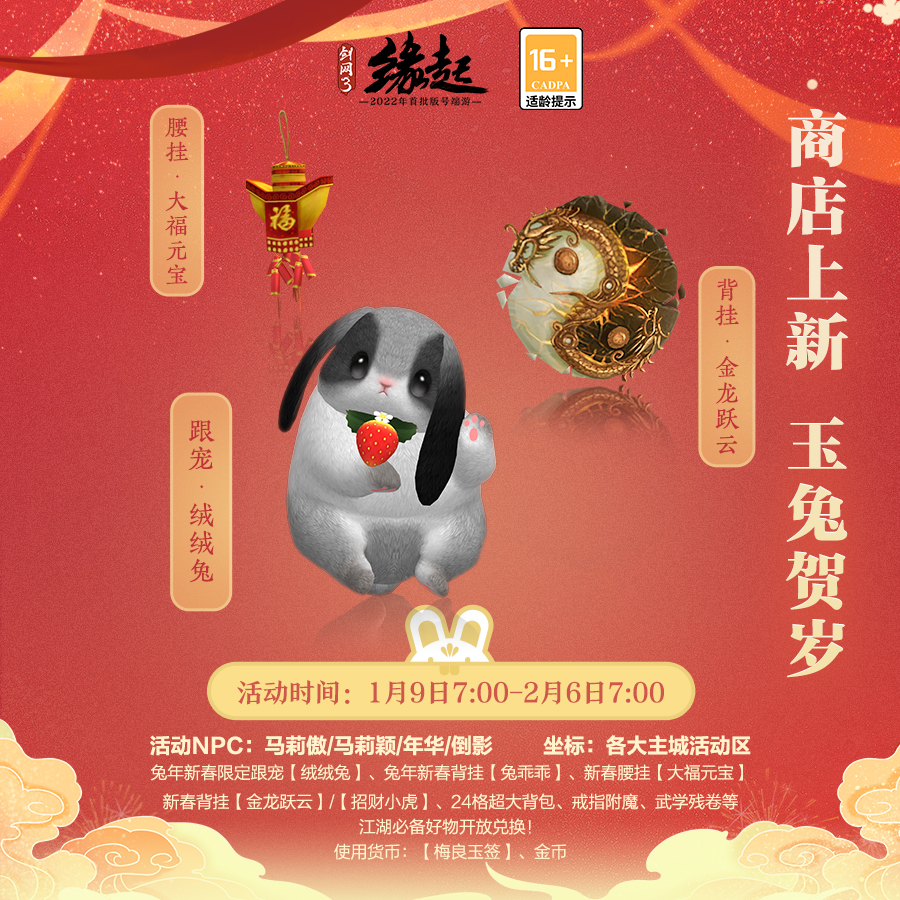 《剑网3缘起》昨日进行了大版本更新,新春盛典随之开启!海量活动与奖励不容错过!为了防止遗漏某些精彩内容,今天为大家整理了昨日更新的主要内容,走过路过千万不要错过啦! 【全民养老季 休闲更轻松】 新年新气象新展望,《剑网3缘起》全民乐享休闲养老季上线! 强减负、尽优化、上玩法、护萌新、有搞头,五大调优革新创造更轻松、更简单、更好玩的游戏环境,打造休闲养老武侠网游!萌新装备无痛过度,调整副本难度进阶更丝滑,橙饰、附魔轻松拥有,降低玩法门槛增加产出;抓马驯养系统随机属性、PVP野外玩法新玩法即将开放、尚武遗迹增加白天练习模式随时随地拿奖励,更有赛季挑战加码,达到指定伤害即可获得海量寒川紫贝、银辉玉玦!更多详情长图先睹为快! 【万福添新岁 阵起赋增益】 瑞兔呈祥,万象迎春,兔年新春盛典活动开启! 新春签到送好礼,参与活动共贺春节,必得兔年限定跟宠「绒绒兔」、兔年背挂「兔乖乖」、新春称号「卯兔」及精美新春腰挂/背挂!萌新老友闯荡江湖,海量「寒川紫贝」相赠;武阵加身,助力侠士挑战秘境!玉兔赠喜,许愿可得专属献礼;群侠送福,红包相赠添财运! 【阳春画麒麟 云间梦华海】 玉兔报春,齐换新衣。海量春节佳品上架商城,精美外观经典新春红发“麒月”、奢华包身礼盒“云锦梦华”、狄仁杰限定主题礼盒“海晏拨云”、月度限定外装“阳春”春节上新,静待侠士随心选购。 兔年新春限定红发:麒月 售卖详情:1月9日7:00至2月6日7:00限时不绑定上架商城,售价:38,000通宝。 成男款额发利落自然左垂,长发低束小冠垂金环,发尾随性散落,意气风发;成女款头顶盘云发髻,鬓发绕耳编织垂身前,披发金丝红穗盘绕,温婉淑质;萝莉款刘海微斜梳,两侧编发披肩,蓬松秀发点缀镂金灯笼发饰,娇俏可人。 奢华包身礼盒:云锦梦华 礼盒内含奢华披风、双肩肩饰及精美外装,不仅在单独展示时效果不俗,同时装备四件套后,更可切换特殊披风包身造型,并伴有梦幻动态蝴蝶特效。 售卖详情:礼盒不绑定款于1月9日20:10限量上架800个;绑定款于1月9日20:15至2月6日7:00限时上架,售价:88,800通宝。 成男款外装廓形线条流畅,深蓝上衣外罩立领披肩素白小衣,腰带独特锦鲤设计喻岁有余庆。披风配以厚实白羽镶边,行动间青衣碧羽飘逸。美观外装赋予冬日融融暖意,远阔碧空下星斗浮白云。轻功起惊鸿归云天,招式出游龙翱星海。 成女款整体以蓝色为主色调,不同深浅渐变层次丰富。绒领锦织交叉缠绕肩如玉削,鱼尾状设计衣裙行走如鲛人曳尾,布料层叠垂落随性而自然。披风以满铺云纹靛青为底,中间蔚蓝云状布料柔软延展,顶覆单片深蓝夜幕勾勒星子闪烁。 萝莉款洁白披肩边镶细绒,收于胸前灵巧蝴蝶结,披风背后蓝白渐变大蝴蝶结与衣裙整体形状相辉映,少女行动轻盈似蝶。纱制衣袖点缀淡蓝花朵垂流苏,素白外裙花边设计如含苞初绽,下裙多种蓝色渐变不规则裁剪,足踏丝履点细花。 狄仁杰限定主题礼盒:海晏拨云 礼盒内含:特效外装、特效面挂、配套白发、配套黑发(绑定版)、加赠限定主题腰挂,各体型外装均有其独特的特效动作表现,挥刀腾跃引游龙盘空,扇舞凝情唤金凤和鸣。特效动作面挂【镜花浮名】有其独特表现,薄纱隐目不遮慧眼,妙舞回旋留芳人间。 售卖详情:不绑定版于1月9日20:05限量上架800个,绑定款于1月9日20:15至2月6日7:00限时上架,售价:52,000通宝 成男款以大理寺官服为设计灵感,肩披金甲精雕腾龙祥云,衣料暗金细闪似光辉勾线织成,下摆金丝勾边绣飞龙,劲装轻便灵活,塑挺拔身姿。发丝尽束头冠,气宇轩昂。 成女款以武后女帝风范为设计灵感,长裙修身腰如约素,裙摆微散迤逦及地,丝绸布料色泽似白玉融金呼吸流动,精工剪裁顶级奢华。镂空纹金簪盘高髻,彰显尊贵威仪。 萝莉款以公主华服为设计灵感,衣裳以娇嫩橙粉鹅黄为主色,高雅质感轻纱透玉肤,精雕花叶如生呼之欲出。刘海鬓发自然垂落,绒团发饰点缀小髻,少女行动轻盈灵巧。 月度限定外装:阳春 售卖详情:1月9日7:00至2月6日7:00限时上架,共两款偏色,售价:20,000通宝,为绑定版。 成男款成衣莹白如落雪,领镶金银腰系玉坠,外衫独特斜开襟,绒毛环肩颈,冬装保暖不失潇洒。 成女款上衣轻盈裹肤,袖绕暖身厚绒,胸前银刻垂细链,流苏点缀分饰身侧,端庄秀丽张弛有度。 萝莉款独特长裙形如灯笼新年添趣,红裙俏丽紫裙雅致,和暖白绒归系镂玉莲花,寓意吉祥如意。 【祥瑞齐报春 红包共添喜】 新春充消三档送特效背挂“瑞鹤仙灯”、腰部挂件“入松烟”、背部挂件“涉川”,活动期间享享1.5倍积分,更有全新烟花“心不释手”上新,限定烟花返场,70级大橙武及小橙武拓印券4.8折特价回归,机不可失! 《剑网3缘起》“剑湖神宫”火爆公测中,免费畅玩!大唐张灯结彩贺新春,珍宝礼厚佳品多!欢迎各位侠士重游故地,追寻昔日江湖情! 更多《剑网3缘起》相关资讯,可以关注叶子猪的《剑网3缘起》官方合作专区 |