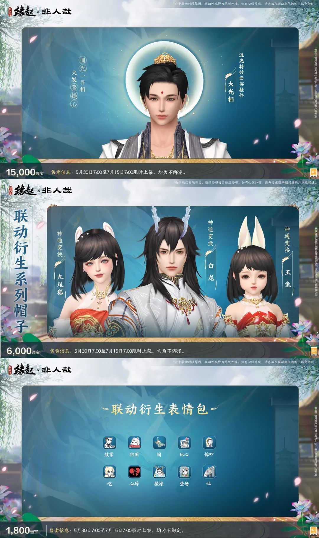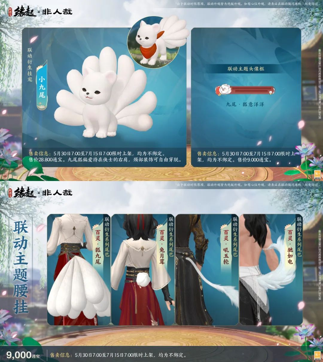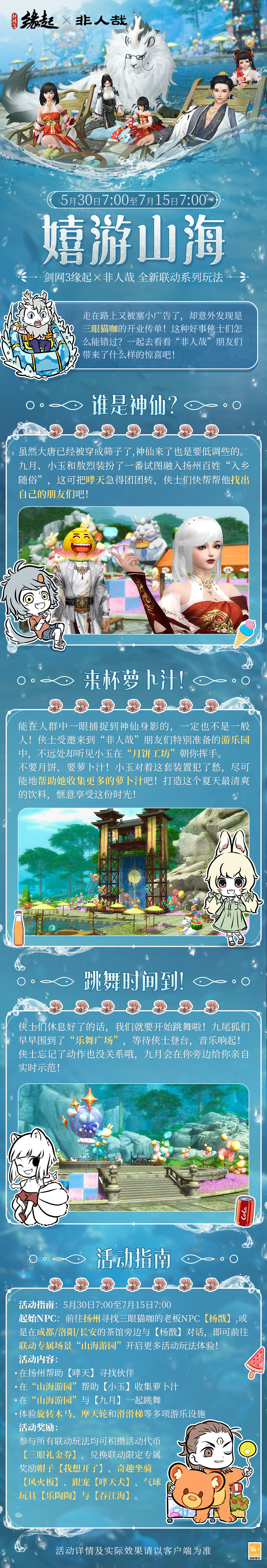 跳出三界,缘起相见! 《剑网3缘起》x《非人哉》漫画 破次元联动来袭! 妖怪界的资深阿宅“九月” 和真·神仙小伙伴们 要来大唐与侠士一起修行啦~ 神仙咖啡厅、夏季游乐园 灵狐白龙、观音哪吒… 惊喜联动活动爆料在此 海量奖励等你拿 快看围观神仙打架↓ 全新联动系列玩法欢乐上线 >>>联动活动限定好礼来袭侠士可以在活动专属场景中,通过帮助可爱神仙们解决烦恼和难题,或是体验摩天轮等娱乐设施,获得活动代币“三眼礼金券”,兑换联动限定专属帽子“我想开了”、奇趣坐骑“风火板“、跟宠“哮天犬”与气球玩具等奖励。超多惊喜好礼,不容错过!(点击大图查看详情) >>>“嬉游山海”童趣启程5月30日7:00至7月15日7:00,趣味联动系列玩法“嬉游山海”欢乐上线!三眼猫咖的老板“杨戬”盛情邀请你前往联动专属场景“山海游园”,在神通广大的小伙伴们打造的奇妙游乐园里,一起上天入地,盛夏狂欢!(滑动查看活动详情)· · >>>联动活动专属地图抢先看(滑动查看活动详情)· 联动衍生外观礼盒「龙吟四海」 白龙纵浪大化中,九尾盘桓山水间。联动衍生外观礼盒「龙吟四海」设计灵感来自西海龙王三太子“敖烈”和妖界阿宅九尾狐“九月”,以山海灵物元素点缀,尽显神兽之态。 开启外观特效,成男款可召唤白龙真身,伴有灵云四起,祥瑞磅礴;成女款可召唤灵狐真身,轻盈跃出,仙韵十足! 礼盒内包含特效背部挂件「如意壶」,开启特效后可提壶掺茶,闲看庭前花开花落,漫随天外云卷云舒,尽显逍遥自在~ >>>售卖信息 礼盒内含:定制成衣、绑定款定制黑发、定制白发、定制特效背部挂件「如意壶」; 礼盒售价:52,000通宝。 售卖时间:不绑定款将于5月30日20:05上架800份;绑定款将于5月30日20:15至7月15日7:00限时上架。 联动衍生外观礼盒「莲台清咏」 我来问道无余说,云在青天水在瓶。联动衍生外观礼盒「莲台清咏」设计灵感来源于“大士”和“哪吒”的人物特色,结合东方神话禅意之美, 疏朗自在。 外观特效开启后,成男、成女款大士光相骤亮,莲台宝座升起,吟诵祝祷,大道观心!萝莉款可得哪吒之法相,风火轮烨烨而舞,一世无双。 礼盒内包含特效背部挂件「玉净瓶」,此乃大士的钟爱之物,与时俱进化形为吸管套杯,实乃不可多得的神仙法器,侠士来尝一口里面装的是奶茶还是玉露呢? >>>售卖信息 礼盒内含:定制成衣、绑定款定制黑发、定制白发、定制特效背部挂件「如意壶」; 礼盒售价:52,000通宝。 售卖时间:不绑定款将于5月30日20:10上架800份;绑定款将于5月30日20:15至7月15日7:00限时上架。 把正要踩着风火板回家的发型师抓回来了!会连夜修改一下萝莉的发包和刘海,明天更新展示照片~· 超萌联动挂宠、系列尾巴与头像框 黏人可爱的神兽“小九尾”来陪伴侠士一起游历大唐啦!九尾狐家族的小狐狸化身为联动衍生挂宠,尤其偏爱待在侠士们右肩上,蓬松灵动的毛茸茸可以治愈一切烦恼! 更有精美华丽的联动主题「莲台清咏」、「龙吟四海」同款动态头像框、憨态可掬的挂宠同款头像框,以及四款非人哉联动衍生系列尾巴同步上架,神仙同款穿搭,轻松拿下! >>>动态头像框售卖信息 售卖时间:5月30日20:15-7月15日7:00限时上架,为不绑定款。 售卖内容:联动主题同款动态头像框「像韵·莲台清咏」「像韵·龙吟四海」,售价15,000通宝。 (点击大图查看详情) >>>尾巴、挂宠及同款头像框售卖信息 售卖时间:5月30日7:00-7月15日7:00限时上架,均为不绑定款。 售卖内容: 联动尾巴礼盒,售价9,000通宝。 挂宠「小九尾」,售价28,800通宝。 挂宠同款头像框「九尾·狐意洋洋」,售价9,000通宝。 (点击大图查看详情) 联动面部挂件、耳朵礼盒与表情包 百搭的“神仙单品”限时上架,任君选择!大士的同款联动特效面挂「大光相」方寸灵山,法相庄严,大士既将它当做菩提法宝,又当做照明灯或充电宝,实乃居家旅行之必备好物! 各路神仙的同款耳朵也萌趣来袭,共有三款联动衍生主题帽子礼盒可选。是变成狐狸还是龙呢?或许当一回玉兔也不错! 远道而来的神仙伙伴们还将可爱神韵留存在一张张表情包中,感兴趣的侠士快来看看有没有你想要的角色~ >>>售卖信息 售卖时间:5月30日7:00-7月15日7:00限时上架,均为不绑定款。 售卖内容: 特效面挂「大光相」,售价15,000通宝。 联动衍生主题帽子礼盒,售价6,000通宝。 联动主题表情包,售价1,800通宝。 (点击大图查看详情) 充消好礼加码,三倍积分回馈 第四档充消奖励加码!传说中的神兽白泽一族化身奇趣坐骑来陪伴大侠啦~活动期间通宝充值消费满300元即可直接带回家! 3倍积分回馈活动开启,5月30日7:00至7月15日7:00期间,充值消费通宝可获得3倍积分!整整一个半月的三倍,需要积分的侠士这次可要抓紧机会。 *5月13日开售的限时外观不参与本次3倍积分活动 半价捏脸、半价拓印活动开启,商城小玩意儿也统统半价!还有商城发型9折、商城成衣9折活动,在盛夏来临之前变美就趁现在! (点击大图查看详情) 六一佳节将至,神仙联名携夏日限定活动童趣来袭,大家期待已久的联名礼盒、联名系列衍生单品即将上架! 心动的侠士可不要错过啦,快喊上亲友一起嬉游山海,选购心仪外观,美美参加活动领取福利吧~ 更多活动资讯,请锁定叶子猪《剑网3怀旧服》官方合作专区。 |