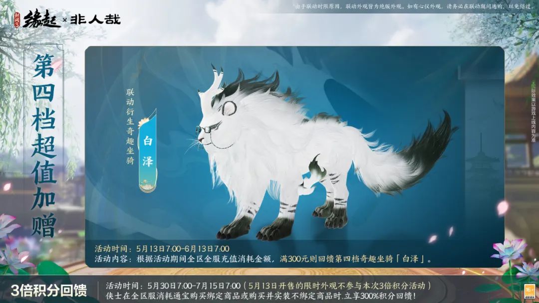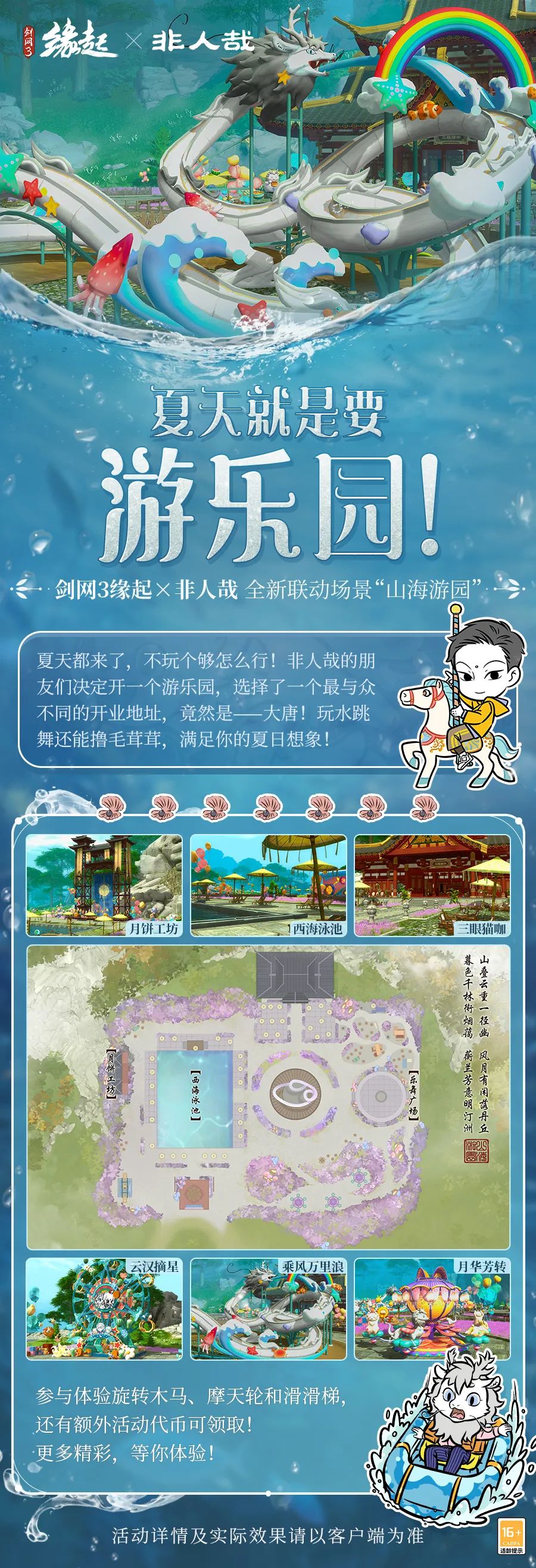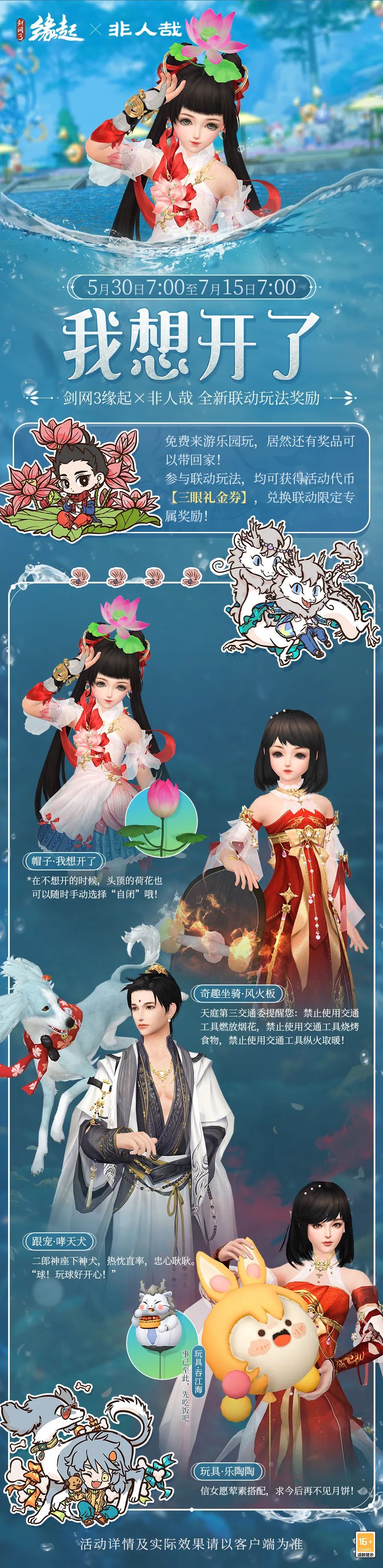 跳出三界,缘起相见! 《剑网3缘起》x《非人哉》漫画 破次元联动来袭! 妖怪界的资深阿宅“九月” 和真·神仙小伙伴们 要来大唐与侠士一起修行啦~ 神仙咖啡厅、夏季游乐园 灵狐白龙、观音哪吒… 惊喜联动活动爆料在此 海量奖励等你拿 快看围观神仙打架↓ 全新联动系列玩法欢乐上线 >>>联动活动限定好礼来袭侠士可以在活动专属场景中,通过帮助可爱神仙们解决烦恼和难题,或是体验摩天轮等娱乐设施,获得活动代币“三眼礼金券”,兑换联动限定专属帽子“我想开了”、奇趣坐骑“风火板“、跟宠“哮天犬”与气球玩具等奖励。超多惊喜好礼,不容错过!(点击大图查看详情) >>>“嬉游山海”童趣启程5月30日7:00至7月15日7:00,趣味联动系列玩法“嬉游山海”欢乐上线!三眼猫咖的老板“杨戬”盛情邀请你前往联动专属场景“山海游园”,在神通广大的小伙伴们打造的奇妙游乐园里,一起上天入地,盛夏狂欢!(滑动查看活动详情)· · >>>联动活动专属地图抢先看(滑动查看活动详情)· 联动衍生外观礼盒「龙吟四海」 白龙纵浪大化中,九尾盘桓山水间。联动衍生外观礼盒「龙吟四海」设计灵感来自西海龙王三太子“敖烈”和妖界阿宅九尾狐“九月”,以山海灵物元素点缀,尽显神兽之态。 开启外观特效,成男款可召唤白龙真身,伴有灵云四起,祥瑞磅礴;成女款可召唤灵狐真身,轻盈跃出,仙韵十足! 礼盒内包含特效背部挂件「如意壶」,开启特效后可提壶掺茶,闲看庭前花开花落,漫随天外云卷云舒,尽显逍遥自在~ >>>售卖信息 礼盒内含:定制成衣、绑定款定制黑发、定制白发、定制特效背部挂件「如意壶」; 礼盒售价:52,000通宝。 售卖时间:不绑定款将于5月30日20:05上架800份;绑定款将于5月30日20:15至7月15日7:00限时上架。 联动衍生外观礼盒「莲台清咏」 我来问道无余说,云在青天水在瓶。联动衍生外观礼盒「莲台清咏」设计灵感来源于“大士”和“哪吒”的人物特色,结合东方神话禅意之美, 疏朗自在。 外观特效开启后,成男、成女款大士光相骤亮,莲台宝座升起,吟诵祝祷,大道观心!萝莉款可得哪吒之法相,风火轮烨烨而舞,一世无双。 礼盒内包含特效背部挂件「玉净瓶」,此乃大士的钟爱之物,与时俱进化形为吸管套杯,实乃不可多得的神仙法器,侠士来尝一口里面装的是奶茶还是玉露呢? >>>售卖信息 礼盒内含:定制成衣、绑定款定制黑发、定制白发、定制特效背部挂件「如意壶」; 礼盒售价:52,000通宝。 售卖时间:不绑定款将于5月30日20:10上架800份;绑定款将于5月30日20:15至7月15日7:00限时上架。 把正要踩着风火板回家的发型师抓回来了!会连夜修改一下萝莉的发包和刘海,明天更新展示照片~· 超萌联动挂宠、系列尾巴与头像框 黏人可爱的神兽“小九尾”来陪伴侠士一起游历大唐啦!九尾狐家族的小狐狸化身为联动衍生挂宠,尤其偏爱待在侠士们右肩上,蓬松灵动的毛茸茸可以治愈一切烦恼! 更有精美华丽的联动主题「莲台清咏」、「龙吟四海」同款动态头像框、憨态可掬的挂宠同款头像框,以及四款非人哉联动衍生系列尾巴同步上架,神仙同款穿搭,轻松拿下! >>>动态头像框售卖信息 售卖时间:5月30日20:15-7月15日7:00限时上架,为不绑定款。 售卖内容:联动主题同款动态头像框「像韵·莲台清咏」「像韵·龙吟四海」,售价15,000通宝。 (点击大图查看详情) >>>尾巴、挂宠及同款头像框售卖信息 售卖时间:5月30日7:00-7月15日7:00限时上架,均为不绑定款。 售卖内容: 联动尾巴礼盒,售价9,000通宝。 挂宠「小九尾」,售价28,800通宝。 挂宠同款头像框「九尾·狐意洋洋」,售价9,000通宝。 (点击大图查看详情) 联动面部挂件、耳朵礼盒与表情包 百搭的“神仙单品”限时上架,任君选择!大士的同款联动特效面挂「大光相」方寸灵山,法相庄严,大士既将它当做菩提法宝,又当做照明灯或充电宝,实乃居家旅行之必备好物! 各路神仙的同款耳朵也萌趣来袭,共有三款联动衍生主题帽子礼盒可选。是变成狐狸还是龙呢?或许当一回玉兔也不错! 远道而来的神仙伙伴们还将可爱神韵留存在一张张表情包中,感兴趣的侠士快来看看有没有你想要的角色~ >>>售卖信息 售卖时间:5月30日7:00-7月15日7:00限时上架,均为不绑定款。 售卖内容: 特效面挂「大光相」,售价15,000通宝。 联动衍生主题帽子礼盒,售价6,000通宝。 联动主题表情包,售价1,800通宝。 (点击大图查看详情) 充消好礼加码,三倍积分回馈 第四档充消奖励加码!传说中的神兽白泽一族化身奇趣坐骑来陪伴大侠啦~活动期间通宝充值消费满300元即可直接带回家! 3倍积分回馈活动开启,5月30日7:00至7月15日7:00期间,充值消费通宝可获得3倍积分!整整一个半月的三倍,需要积分的侠士这次可要抓紧机会。 *5月13日开售的限时外观不参与本次3倍积分活动 半价捏脸、半价拓印活动开启,商城小玩意儿也统统半价!还有商城发型9折、商城成衣9折活动,在盛夏来临之前变美就趁现在! (点击大图查看详情) 六一佳节将至,神仙联名携夏日限定活动童趣来袭,大家期待已久的联名礼盒、联名系列衍生单品即将上架! 心动的侠士可不要错过啦,快喊上亲友一起嬉游山海,选购心仪外观,美美参加活动领取福利吧~ 更多活动资讯,请锁定叶子猪《剑网3怀旧服》官方合作专区。 |