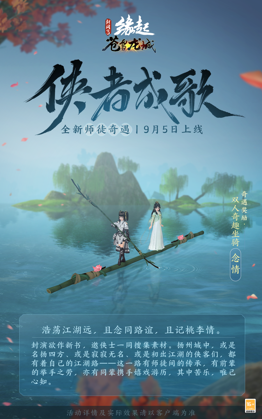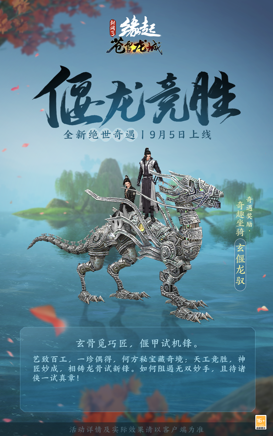 今天是8月27日,星期二 咳咳,各部门注意啊,我宣布9月5日,苍雪龙城新赛季新奇遇来啦!就这么开门见山,就这么毫无铺垫,祝侠士欧气满满,一“摸”入魂! 快来看看都有哪些好玩的奇遇吧?? 三重奇遇一并来袭 缘起全新绝世奇遇「偃龙竞胜」即将上线。天工竞胜,神匠妙成,相铸龙骨试新锋。如何阻遏无双妙手,且待诸侠一见真章! ?奇遇奖励双人奇趣坐骑「玄偃龙驭」,金骨铮然,铸合无隙,奔行间隐约有龙啸之声传来。 另有经典奇遇「故园风雨」、「侠者成歌」同步上线,可爱修勾「悦月」、双人奇趣坐骑「念情」等你带回家! (点击大图查看详情↓) 更多游戏动态,请锁定叶子猪《剑网3怀旧服》官方合作专区。 |