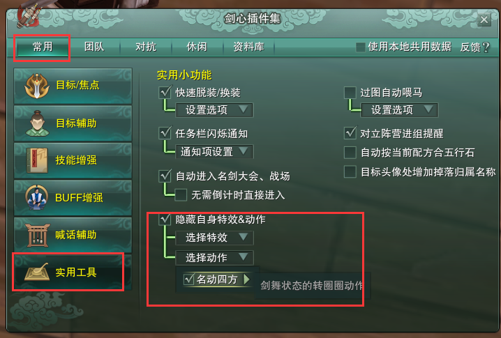 七秀没进战的时候能不能不转圈啊,我的背挂,挂宠,小裙子都因为转圈变得不安逸了! 答 目前可以在剑心插件集中,通过“常用-使用工具-隐藏自身特效&动作”选择隐藏七秀名动四方的动作状态。 问