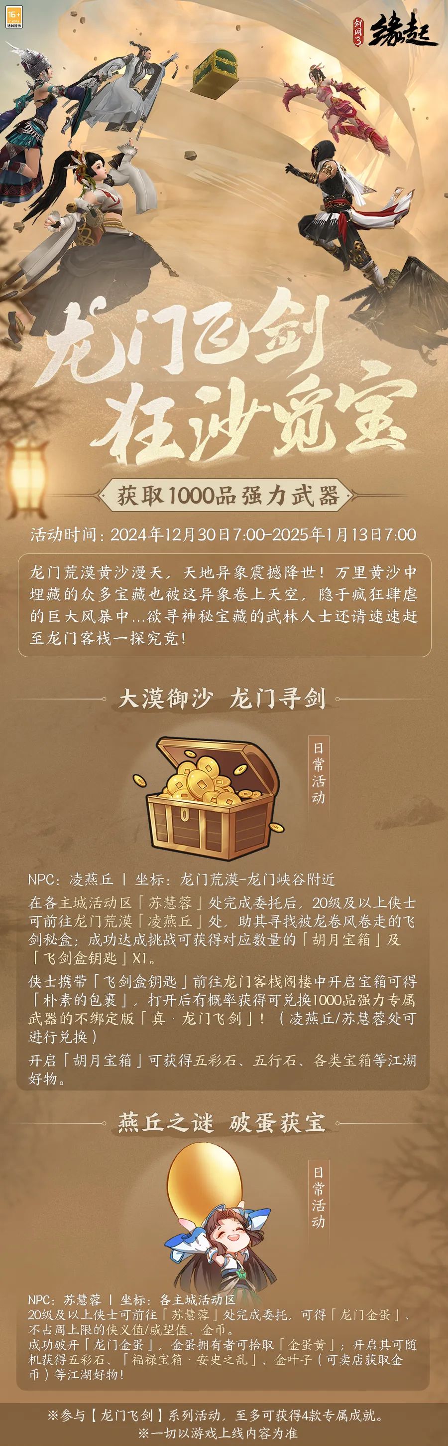飞剑再度现世,1000品武器携特殊效果来袭!万里黄沙中埋藏着众多宝藏,这个平平无奇的包裹里居然藏着神兵? 龙门荒漠黄沙漫天,天地异象震撼降世!前往龙门风沙中寻找秘宝,便有机会获得不绑定版1000品强力特效武器兑换道具! 特效武器输出心法属性为破防无双,治疗心法属性为治疗会心,防御心法属性为外防御劲。 破解燕丘之谜,击碎龙门金蛋,更有五行石/五彩石/福禄宝箱/金币等江湖好物相赠! 更多官方资讯,请继续锁定叶子猪《剑网3怀旧服》官方合作专区。 |