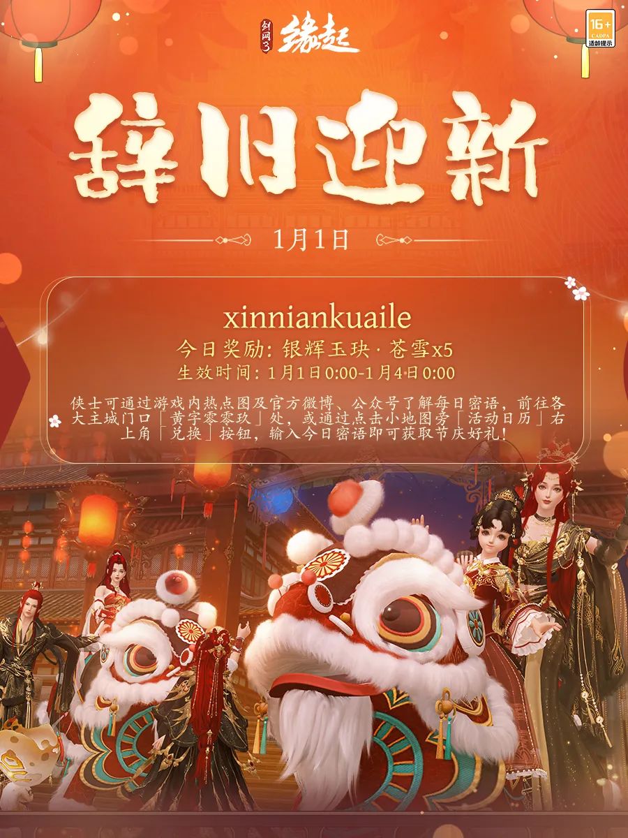 本期「制作人怎么说」 不少侠士反馈了秦皇陵难度较高的情况,我们会进行小规模的优化,同时,剑踪幻域的优化我们也在持续推进中。 此外,战八方调息错误的问题已经修复,降低了隐元武卫对阵营对战的影响,宠物出行玩法收益也将优化。期待这些改变能带来更好的游戏体验! 辞旧迎新 元旦献礼激活码今日解锁,可兑换「银辉玉玦·苍雪」x5。 缘起娘将连续3日为侠士们送上节日赠礼,新年第一份好礼轻松获取! 微社区反馈 问