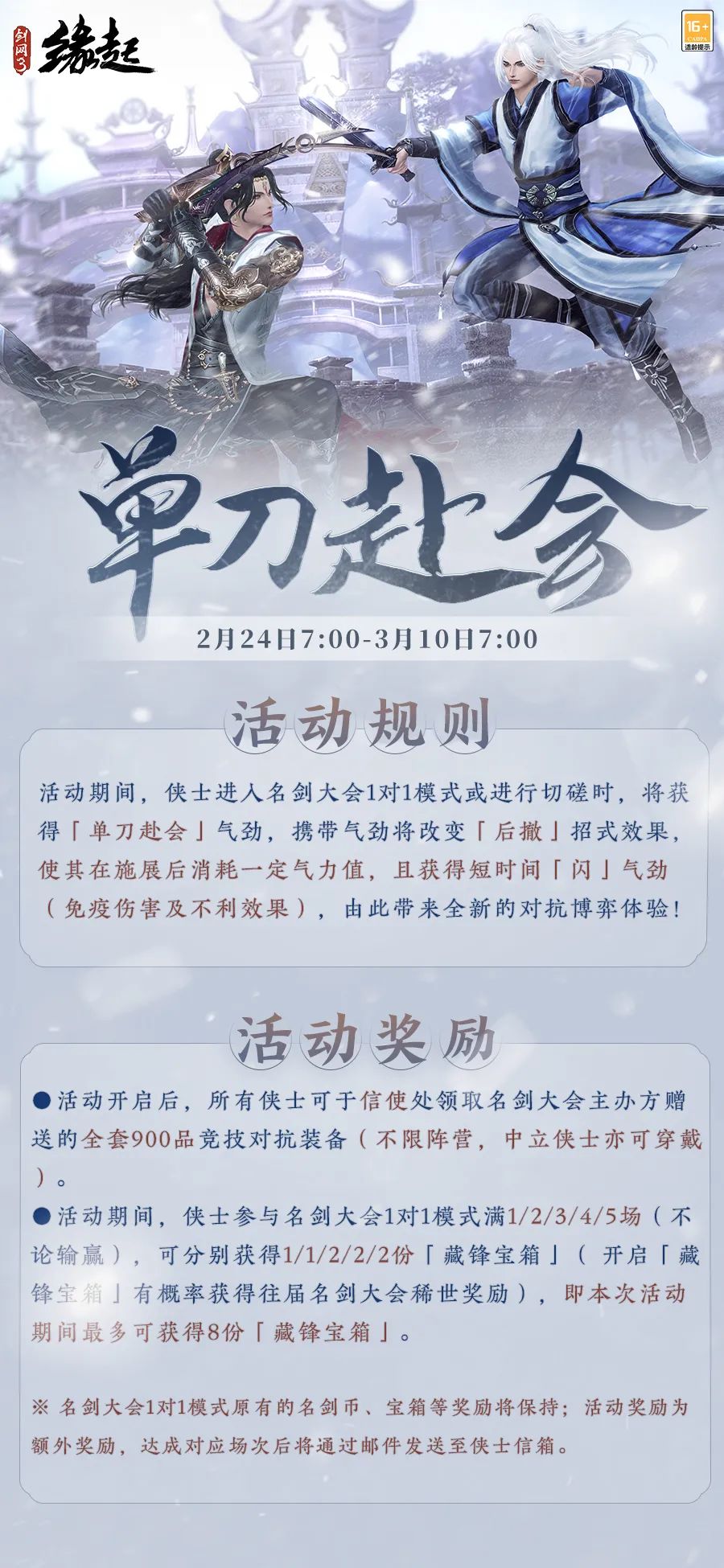 今天是2月24日,星期一。无相归寂灭,时烬入虚无。 全新击伤特效称号「无相时烬」震撼登场!2月24日20:05至3月3日7:00享半价折扣。 「烽火燎原」预热活动今日开启,赛季加速活动也同步开启,「锦绣霓裳」活动升级返场,多重豪礼,助侠士快人一步。 名剑大会1对1模式,全新活动「单刀赴会」今日上线,剑决巅峰,等你来战 01、全新击伤特效称号「无相时烬」 全新击伤特效称号「无相时烬」上架商城!2月24日20:05至3月3日7:00该款特效享半价折扣,折后34,400通宝。 携带该特效并佩戴对应称号重伤/最佳协伤敌人(含秘境首领)时,会展示特效及专属重伤播报效果。 02、「烽火燎原」预热活动+赛季加速 「烽火燎原」预热活动今日开启,参与即可获得「银辉玉玦·苍雪」、永久背部挂件「彻骨寒」、「990品全套基础装备」(除武器外)等丰厚奖励! 03、「锦绣霓裳」活动升级返场 「锦绣霓裳」活动升级返场,累积「云锦华瓣」即可领取「崇武令」、「银辉玉玦·苍雪」、绑定「五行石(七级)」等丰富好礼。 04、名剑大会1对1模式「单刀赴会」 名剑大会1对1模式全新活动「单刀赴会」今日上线,除原本的名剑大会奖励外,参与1V1模式还可额外获得8份「藏锋宝箱」奖励! 更多官方动态,请锁定叶子猪《剑网3怀旧服》官方合作专区。 |