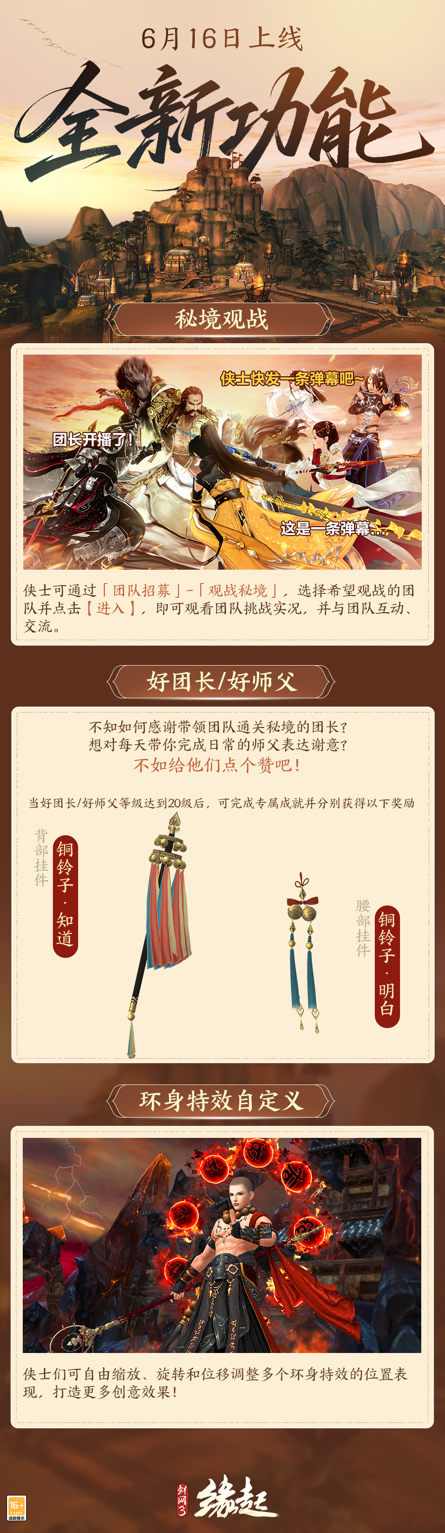 《剑网3缘起》赛季中期版本今日震撼上线!西山居30周年献礼,水墨主题纪念外装「风雨三旬」登录即领!全新团队秘境「太原之战·逐虎驱狼」开启,太原之战一触即发!行侠豪侠好礼更新,完成周常玩法即可领取多重豪礼!秘境观战、环身特效自定义等全新功能齐上线,更有奇遇「凌云梯」、「锋芒展」、「枫林酒」静候侠士前来探寻! 水墨主题纪念外装「风雨三旬」免费领取 风雨兼程数十载,西山居迎来了自己的30岁!值此三十周年庆典之际,为感谢全体侠士的多年陪伴,我们准备了水墨主题纪念外装「风雨三旬」。本次纪念外装设计灵感来自西山居经典水墨动画水印,设计上注重利落剪裁,着重彰显侠者气质。风雨三旬,侠贯始终,6月16日7:00起,满20级侠士可在花萼楼直接领取外装,感谢侠士们一路的理解与支持!未来我们也将更加努力,力争为侠士提供更好的玩法内容与用户体验,展望未来,愿与侠士们携手同行,一起开启更多新篇章! 捏脸半价、体型半价、商城常规发型成衣九折等多重商城折扣活动也将同步开启,助力侠士随心换新装! 太原之战·逐虎驱狼 至德二载正月,史思明、蔡希德、高秀岩、牛延珍分率共十万兵力自博陵、上党、大同、范阳合攻太原,谋取河东,进犯朔方、河西、陇右等地,太原会战激战数十日,两军胶着。一月下旬,黑水靺鞨、龟兹援军兵临城下,史思明得此两路奇兵,还有原创首领「月华」助力,太原将陷入更危急的境地,亟需侠士驰援破围! 攻打秘境可获得秘境1270品精简、特效精简、特效、江湖装备及门派霜天套装兑换牌,「白陶」及「史思明」更有概率掉落「沉沙玄晶」!全新秘境外观「楼兰旖语·墨絮」亦将惊艳亮相,设计灵感取自异域风格民族服装,尽显大漠豪情!「月华」、「史思明」均有几率掉落,祝各位侠士得偿所愿,小红手一摸通通收入囊中! 侠影留声,武林共醉!全新活动「侠影留声」开启,通关对应首领有概率掉落往期秘境特殊掉落自选礼盒,助力侠士江湖圆梦,再启新程! 行侠令豪礼焕新 行侠、豪侠奖励焕新!参与每周玩法即可获取金币、五行石等江湖实用好物,更有绑定版七级五行石倾情相赠,助力侠士无忧畅游江湖!解锁豪侠令即得披风「空山闲雪」,全新布料系统加持,惊喜升级!还有萌趣表情包、逗趣跟宠「凶凶虎」、绑定版八级五行石等豪礼奉上!激活「豪侠令·望」额外加赠俏皮鸭鸭头像框「像韵·酷鸭」! 版本新功能 江湖迎新景 秘境观战功能今日开启!侠士可通过发送弹幕为正在秘境中鏖战的团队加油助威!「好团长/好师父」点赞系统上线,动动小手,为你的好团长/好师父点一个小小的赞吧!达成指定成就还有惊喜挂件奖励!环身特效自定义功能开放,旋转、缩放、位移,自由调整,随心而动,展现大美江湖恣意百态! 全新奇遇 因缘际会 偶然遇到两名江湖人士,在名剑大会附近讨论什么……龙门荒漠鸣沙山下,你意外挖出了特别的珍宝;枫华谷的马四似乎有事想请侠士帮忙? 全新奇遇「凌云梯」携宠物奇遇「锋芒展」、「枫林酒」今日上线,将谱写怎样动人心弦的篇章?侠士不妨前往一探,或许这些江湖奇缘正待侠士前来开启呢? 《剑网3缘起》赛季中期版本今日开启!新秘境、新功能、新奇遇,还有西山居30周年纪念外装免费相赠!行侠豪侠好礼焕新,全新披风布料惊喜升级!更多精彩内容尽在《剑网3缘起》。 |
