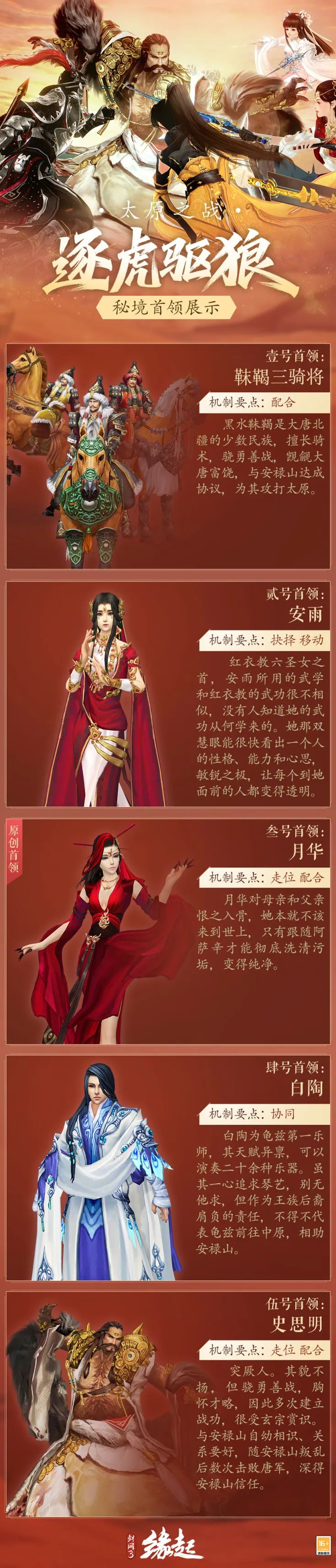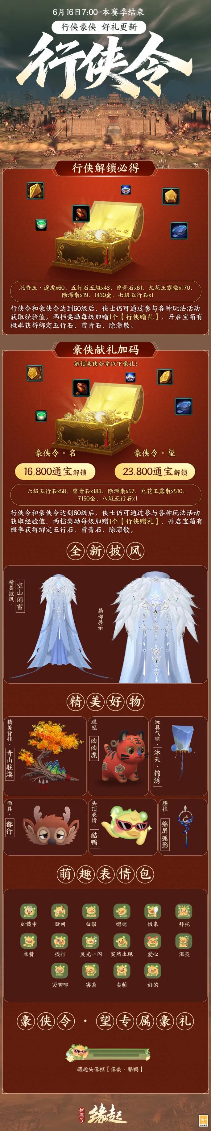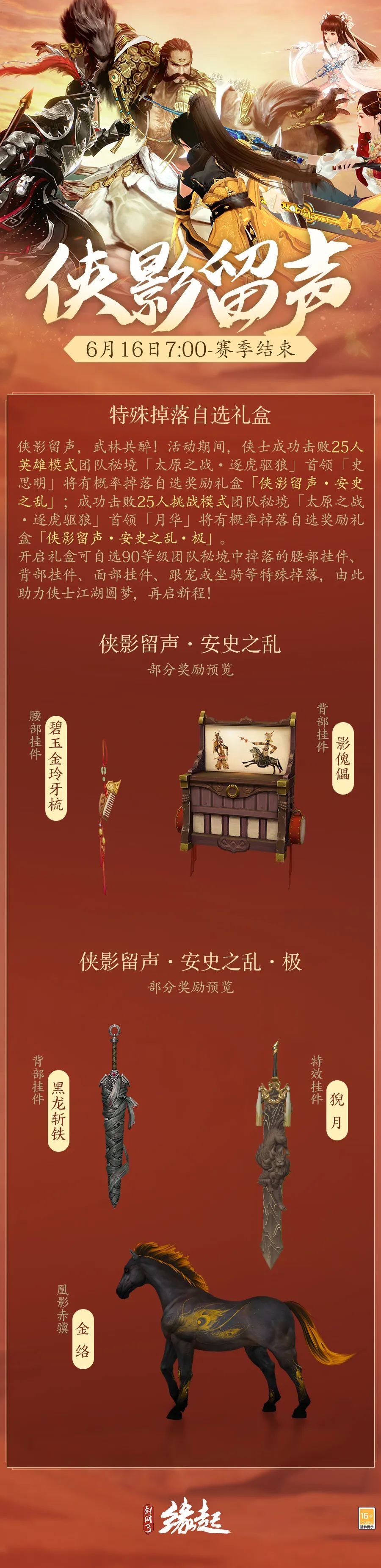赛季中期更新今日上线! 全新团队秘境开启, 行侠豪侠好礼更新, 新功能齐上线, 新奇遇更待侠士们前来探寻! 纪念外装「风雨三旬」免费领取 风雨兼程数十载,西山居迎来了自己的30岁!值此三十周年庆典之际,为感谢全体侠士的多年陪伴,我们准备了水墨主题纪念外装「风雨三旬」。本次纪念外装设计灵感来自西山居经典水墨动画水印,设计上注重利落剪裁,着重彰显侠者气质。风雨三旬,侠贯始终,6月16日7:00起,满20级侠士可在花萼楼直接领取外装,感谢侠士们一路的理解与支持!未来我们也将更加努力,力争为侠士提供更好的玩法内容与用户体验,展望未来,愿与侠士们携手同行,一起开启更多新篇章! 捏脸半价、体型半价、商城常规发型成衣九折等多重商城折扣活动也将同步开启,助力侠士随心换新装! 太原之战·逐虎驱狼 至德二载正月,史思明、蔡希德、高秀岩、牛延珍分率共十万兵力自博陵、上党、大同、范阳合攻太原,谋取河东,进犯朔方、河西、陇右等地,太原会战激战数十日,两军胶着。一月下旬,黑水靺鞨、龟兹援军兵临城下,史思明得此两路奇兵,还有原创首领「月华」助力,太原将陷入更危急的境地,亟需侠士驰援破围! 攻打秘境可获得秘境1270品精简、特效精简、特效、江湖装备及门派霜天套装兑换牌,「白陶」及「史思明」更有概率掉落「沉沙玄晶」!全新秘境外观「楼兰旖语·墨絮」亦将惊艳亮相,设计灵感取自异域风格民族服装,尽显大漠豪情!「月华」、「史思明」均有几率掉落,祝各位侠士得偿所愿,小红手一摸通通收入囊中! 侠影留声,武林共醉!全新活动「侠影留声」开启,通关对应首领有概率掉落往期秘境特殊掉落自选礼盒,助力侠士江湖圆梦,再启新程! 行侠令豪礼焕新 行侠、豪侠奖励焕新!参与每周玩法即可获取金币、五行石等江湖实用好物,更有绑定版七级五行石倾情相赠,助力侠士无忧畅游江湖!解锁豪侠令即得披风「空山闲雪」,全新布料系统加持,惊喜升级!还有萌趣表情包、逗趣跟宠「凶凶虎」、绑定版八级五行石等豪礼奉上!激活「豪侠令·望」额外加赠俏皮鸭鸭头像框「像韵·酷鸭」! 版本新功能 江湖迎新景 秘境观战功能今日开启!侠士可通过发送弹幕为正在秘境中鏖战的团队加油助威!「好团长/好师父」点赞系统上线,动动小手,为你的好团长/好师父点一个小小的赞吧!达成指定成就还有惊喜挂件奖励!环身特效自定义功能开放,旋转、缩放、位移,自由调整,随心而动,展现大美江湖恣意百态! 全新奇遇 因缘际会 偶然遇到两名江湖人士,在名剑大会附近讨论什么……龙门荒漠鸣沙山下,你意外挖出了特别的珍宝;枫华谷的马四似乎有事想请侠士帮忙? 全新奇遇「凌云梯」携宠物奇遇「锋芒展」、「枫林酒」今日上线,将谱写怎样动人心弦的篇章?侠士不妨前往一探,或许这些江湖奇缘正待侠士前来开启呢? |