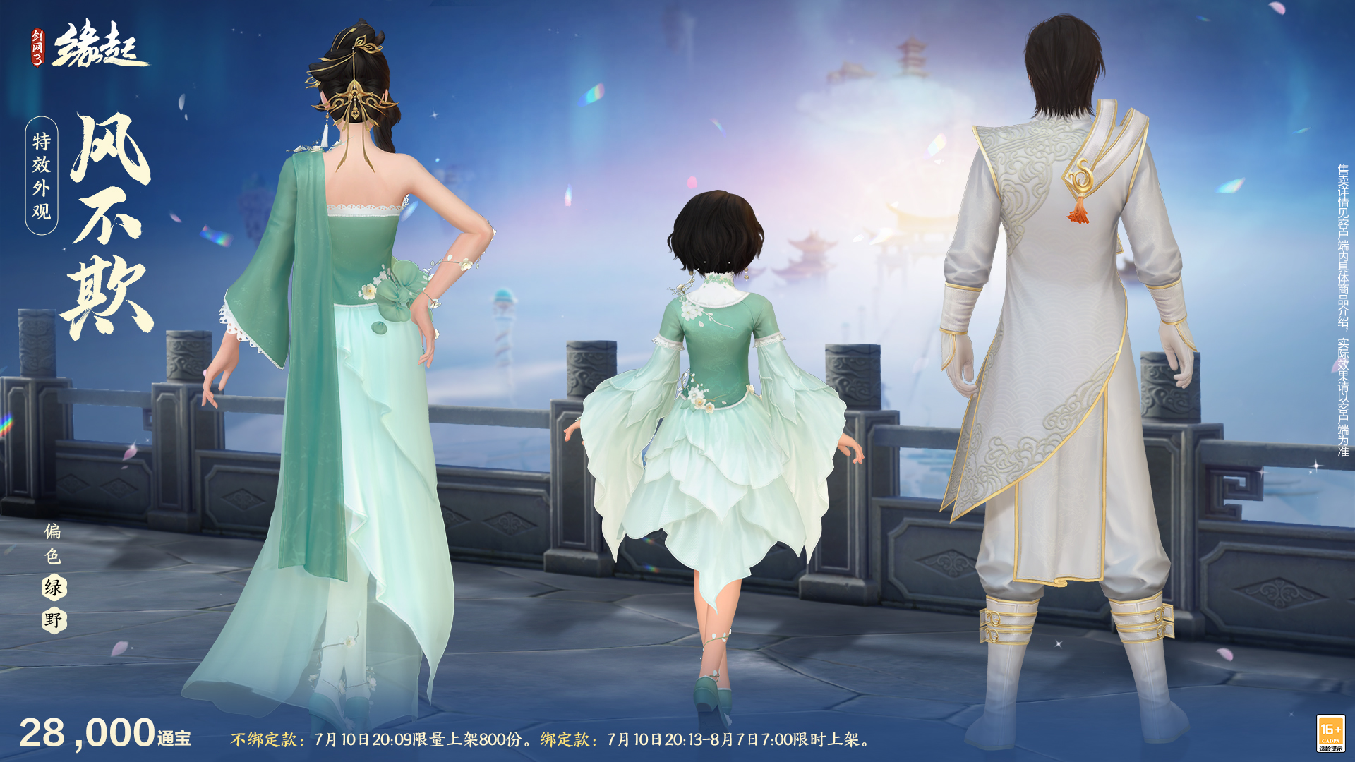 七月暑渐浓,蝉声入深林。《剑网3缘起》夏季佳品于7月10日清爽上新!若游龙主题礼盒「悠游九阙」、特效外观「风不欺」、特效世界称号「净语」、披风「山河颂·剑意白虹」、月度限定外观「策马弯弓」火热开售,共赏江湖新风尚!更有全新充消好礼「羽奢靡金」、1.5倍积分回馈侠士,一同点燃激情盛夏吧! 若游龙主题外观礼盒「悠游九阙」 天风拂尽云尘霭,九阙瑶台,仙袖轻扬,自裁虹霞作霓裳。全新若游龙主题外观礼盒「悠游九阙」乘云而来。 外装以"游龙乘云"为韵,三体同承广袖流纨之制,或翩若惊鸿,或威如潜渊,或灵似戏珠。衣袂金线银针交织,泛出流光溢彩,宛若龙游九天。 成男款外袍素白,剪裁得体,肩部与衣缘处以金线勾勒出祥云腾龙之纹,纹样繁而不乱。衬以渐变之蓝色与浅紫,宛若远山之黛与天际流霞融汇,光华流转。 成女款外层轻纱如雾,腰间束以朱红丝绦,缀有镂空金饰与青翠流苏,收束纤腰如柳。裙身分裁,湛蓝、深紫与流金交织,云波纹样婉转灵动,似银蛟潜游,步履间尽是飘逸与清雅。 萝莉款衣裙轻巧,上身以鹅黄、淡蓝与纯白拼接,层叠交错,玲珑剔透若骊珠在握。袖子精短可爱,以多层薄纱叠就,其间隐现柔和之色彩。裙摆裁剪出多片交错的花瓣或翎羽,内衬同为深浅蓝紫金的云波图案,色彩鲜明,层次丰富。 售卖信息: 售价52,000通宝。 不绑定款:7月10日20:05上架300份, 绑定款:7月10日20:13-8月7日7:00限时上架。 特效披风「山河颂·剑意白虹」 白虹开练影,云袖拂剑光。#剑网3缘起# 全新披风「山河颂·剑意白虹」即将上架。 披风裁制,极尽巧思。以数层蝉翼般轻薄的罗纱叠就,整体以皎洁素白为主调,内层隐约透出绛粉底色,风姿绰约;碎星微光点缀其间,熠熠生辉,如梦如幻。 轻纱层叠,像初展的花瓣,又仿佛仙鹤舒展的羽翼,更显侠士身姿挺拔,透着一股含而不露的清雅之气。 售卖信息: 售价68,800通宝。 不绑定款7月10日20:07限量上架300份, 绑定款7月10日20:13-8月7日7:00限时上架。 特效外观「风不欺」 罗绡轻舞,碧叶玉阶,清风不欺其颜色,自裁一袭芙蓉开。特效外观「风不欺」携清风徐徐登场。 布料轻薄如蝉翼,飘逸若流云,任凭清风拂过,不减半分其绰约之姿,恰如其名“风不欺”。衣身或绘以碧叶疏花,或暗纹祥云,皆与自然相和,仿若将山林湖海之景,裁入寸许锦绣,令人望之而心生悠然。 成男款挺括劲秀,显君子之骨。玉白色调,如同初雪覆山。肩部与袖口处以金色勾边,点缀以简练的云水纹,似金玉镶嵌,贵而不俗。 成女款独肩斜襟,如春江水色般莹润,恰似荷叶初绽,清雅动人。裙摆飘逸,宛若浮云,步履之间,轻盈如风中柳絮。裙身与肩部均有花苞点缀,衬得整体如山间清泉般明澈,雅致脱俗,尽显亭亭玉立之姿。 萝莉款以娇俏玲珑之形,尽展少女风姿;上身剪裁贴合,领口与袖缘处以蕾丝点缀,更添几分可人。一簇簇鹅黄色的细碎小花点缀其上,似雀跃的精灵栖息其上。 售卖信息: 售价28,000通宝。 不绑定款7月10日20:09限量上架800份, 绑定款7月10日20:13-8月7日7:00限时上架。 环身特效世界称号净语 壁画金光流转,梵音不语随沙。特效世界称号「净语」登场。 特效整体以莲花为形,绘以曼陀罗纹样,于背后缓缓旋转。金色纹样细腻而璀璨,层叠之间光影流转,将千年前的净土佛光,凝结于方寸之间,令人心生敬畏与向往。佩戴时,仿佛正于香莲之上,诵念着来自远古的净语,遗世而独立。 售卖信息: 售价18,000通宝。 不绑定款7月10日20:11限量上架800份, 绑定款7月10日20:13-8月7日7:00限时上架。 月度限定外观「策马弯弓」 弓开如月射天狼,蹄踏飞霜裂大荒。#剑网3缘起# 月度限定外观「策马弯弓」携新色「影漪」、「琢云」飒沓而来! 衣衫剪裁凌厉,线条流畅,兼顾行动之便与形制之美,尽显劲疾与飒爽。其间辅以金属搭扣、革带缠绕,以及腾云、卷浪等纹样,刚柔并济,既有唐时武士之骁勇,亦不失士族之风雅。 成男款袍服设计极具唐时胡服之风与武者之魂,威仪而挺拔。多以素雅提花描绘暗纹,含蓄而富有质感;腰部系以宽幅革带,缀有白结与亮黄色流苏,更添几分潇洒。 成女款独肩斜襟,或是墨染幽玄,或是雪覆素白,流露出飒爽英姿。肩头以镂空金属片点缀,臂弯处革带缠绕,彰显干练。衣襟以数条革带横束纤腰,勾勒出玲珑曲线,又添几分束身之感。 萝莉款以娇俏利落之形,尽展年少游侠之意趣。胸前及肩部以革带斜束交错,勾勒出纤细身材,似幼虎初试锋芒。下身搭配利落的短裙,裙摆则为层叠的白色纱罗;配以轻薄罗袜,使其足下生风,行动敏捷。 售卖信息: 售价20,000通宝。 7月10日7:00-8月7日7:00限时上架商城,共8款偏色可选,购买绑定。 配套往期黑发同步上架,售价10,000通宝。 ※月度限定外装并非绝版外装,将在每年指定月份开放上架,以便侠士选购。 充消好礼 嘿!侠士,来吃瓜子儿!《剑网3缘起》7月10日三档充消好礼/多倍积分活动同步更新。 充消第三档赠送特效背挂「羽奢靡金」,使用特效后可以随时随地坐下来把瓜子儿、或者吃口冰凉西瓜解解暑。7月10日7:00至7月17日7:00还可享受150%消费积分回馈,诸多惊喜,不容错过! 七月盛夏,暑气渐盛,万物齐秀。《剑网3缘起》7月10日琳琅新品上架商城,主题礼盒、特效外观、环身特效目不暇接,充消回馈豪礼纷呈,诚邀侠士共赴一场盛夏新品盛典! |