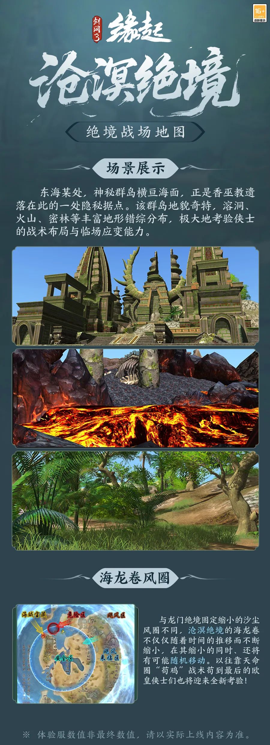 东海幽墟起幻丘,岩峦奇诡水云浮 东海神秘群岛即将揭开面纱! 绝境战场新地图「沧溟绝境」9月4日即将登场 溶洞、火山、密林等多样地形 还有会随机移动缩小的海龙卷风圈 海岛吃鸡新体验 侠士准备好挑战了吗~ 沧溟绝境 沧溟绝境为香巫教遗落在此的一处隐秘据点,岛上多种地形错综分布,丰富资源散布其中。 该地图缩圈机制“海龙卷”有概率随机移动,给侠士带来不一样的体验! >>>全新地图「沧溟绝境」现已登录测试服,侠士可前往先行体验。 |