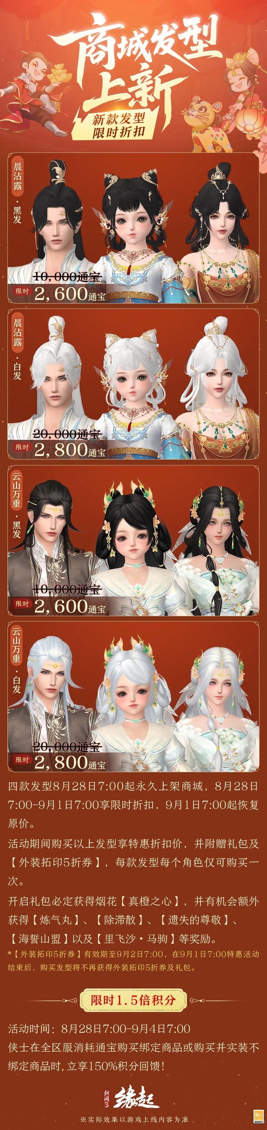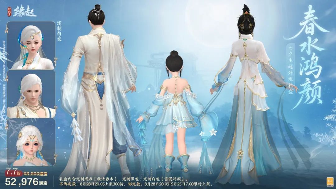 今天是8月26日,星期二 星河漾月裁衣色,鹊渡微光映侠装 七夕商城最新资讯! 全新七夕主题外装礼盒「春水鸿颜」, 带侠士梦回初代七夕礼盒的铭刻瞬间! 礼盒附带双人交互动作及专属七夕幻景 更享7.7折折扣优惠! 超值发型福袋「晨沾露」齐齐上架, 还有限时积分回馈好礼不容错过! 七夕主题礼盒「春水鸿颜」七夕星河,鹊影翩跹,全新七夕主题外装礼盒「春水鸿颜」浪漫而至。 柔白为底,淡蓝晕染,似夜月清辉洒入春水,衣袂舒展间,星芒纹路与鹊桥剪影交织,诉说着七夕的缠绵情思。 成衣可解锁浪漫“公主抱”双人交互动作,将爱意温柔托举。? 身着此套外观可以引领小队成员踏入专属七夕场景“星海幻景”,共赏鹊桥横空、繁星垂落的梦幻盛景,沉浸式奔赴星河之约。 全新发型礼包云丝织就仙娥鬓,玉冠映月缀金枝,全新发型「晨沾露」惊喜上新,另有经典发型「云山万重」特惠返场,四款发型均享限时折扣。 8月28日7:00-9月1日7:00购买发型还可获得礼包及【外观拓印5折券】,礼包开启后更有机会获得【海誓山盟】、【里飞沙·马驹】等好礼。 8月28日7:00-9月4日7:00活动期间,侠士在全区服消耗通宝购买绑定商品或购买并实装不绑定商品时,立享150%积分回馈! |