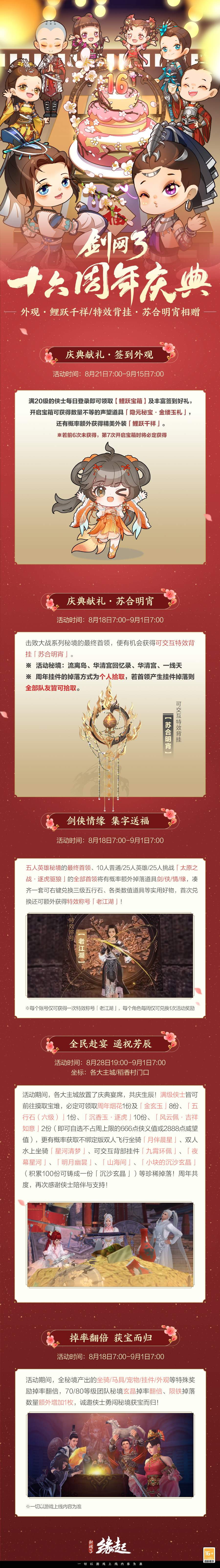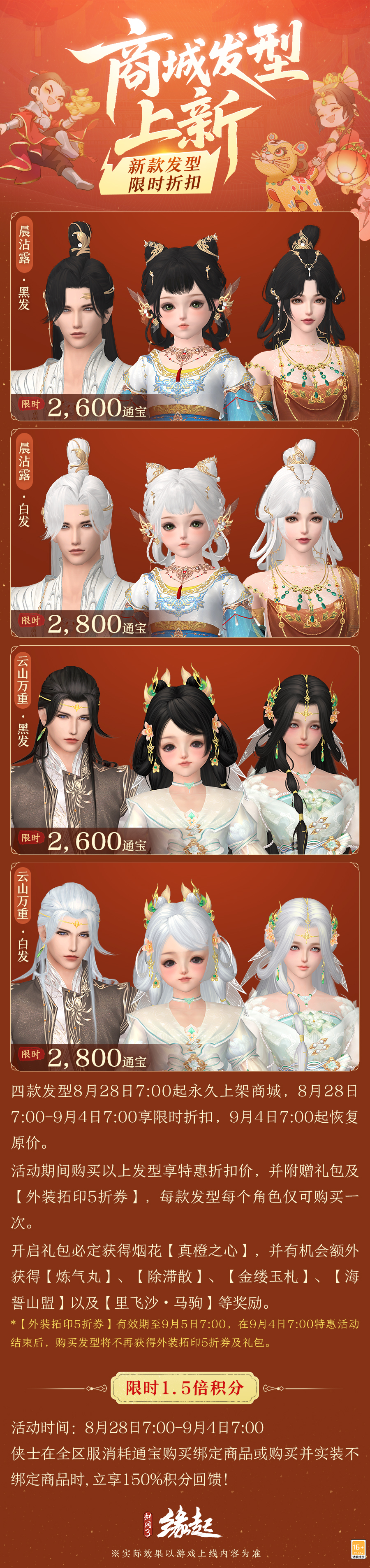 《剑网3缘起》江湖双喜临门!正值大IP16周年庆典盛大启幕,多重精彩活动热力绽放,周年宴席今晚开启,签到外观、周年挂件等活动也在火热进行中;七夕商城同步焕新颜,《剑网3缘起》七夕主题外装礼盒「春水鸿颜」、全新发型「晨沾露」及粒子特效肩饰「漱玉寒」浪漫登场,更有专属交互、限时折扣与积分回馈相伴,邀万千侠士共庆周年、赴七夕星河之约! 剑网3大IP16周年庆典 剑网3大IP十六周年庆典盛大开启,多重精彩活动同步来袭!周年宴席今天19:00开启,满级侠士可赴各大主城及稻香村庆典宴席,领取丰厚奖励,还有概率获得稀有坐骑、背挂等;签到外观、周年挂件、集字活动、掉率翻倍正在火热进行中,诚邀侠士共赴周年盛宴,畅享周年狂欢! 七夕商城焕新颜 视频 星纹缀袂藏情思,鹊渡清辉满侠途。《剑网3缘起》七夕好物登场,邀你共赴浪漫之约。全新七夕主题外装礼盒「春水鸿颜」以柔白衬淡蓝,星芒纹路与鹊桥剪影交织衣间,藏尽缠绵情思;礼服可解锁“公主抱”温柔交互,身着此装更能引小队入“星海幻景”,共赏鹊桥横空、繁星垂落的梦幻盛景。全新发型「晨沾露」携限时折扣登场,墨发缀饰显灵秀,白发覆丝蕴出尘,皆融古典韵味与灵动美感,购发还赠5折拓印优惠券与专属礼包。粒子特效肩饰「漱玉寒」冰晶旋动、微光隐现,三款偏色各有风情,实装同边三款更可得“奇彩”专属款,为江湖扮相添一抹清泠侠气。1.5倍积分回馈同步开启,让浪漫与惊喜常伴侠途! 七夕主题礼盒「春水鸿颜」 七夕星河,鹊影翩跹,全新七夕主题外装礼盒「春水鸿颜」浪漫而至。柔白为底,淡蓝晕染,似夜月清辉洒入春水,衣袂舒展间,星芒纹路与鹊桥剪影交织,诉说着七夕的缠绵情思。 成男款广袖流云,素色衣身隐现银河暗纹,以珍珠与白银做饰,银带束腰,清逸中透着温润; 成女款青丝挽月,月白裙裾缀蓝色星点,臂间薄纱轻垂,行走时暗纹流动,恰似春水漾起的温柔涟漪; 萝莉款蓬松裙摆似云朵裁就,淡蓝飘带随动作轻扬,发间银饰与衣上星纹相衬,宛如从鹊桥边跳下的可爱星灵。 成衣可解锁浪漫“公主抱”双人交互动作,将爱意温柔托举;身着此套外观可以引领小队成员踏入专属七夕场景“星海幻景”,共赏鹊桥横空、繁星垂落的梦幻盛景,沉浸式奔赴星河之约。 售卖信息: 礼盒含7.7折特惠,原价68,800通宝,折后52,976通宝。 礼盒内含定制成衣「秋池春水」、定制黑发、定制白发「雪泥鸿颜」。 不绑定款:8月28日20:05上架300份,绑定款:8月28日20:09-9月25日7:00限时上架。 全新发型福袋 云丝织就仙娥鬓,玉冠映月缀金枝,全新发型「晨沾露」惊喜上新,另有经典发型「云山万重」特惠返场。 墨发款如暗夜流云,发丝自然垂坠,点缀精致金饰,尽显温婉灵秀; 白发款似初雪覆枝,银白丝缕柔和顺滑,搭配同色系华丽配饰,自带清冷出尘气质。 无论成男的儒雅束发、成女的柔美编发,还是萝莉的俏皮发髻,都将古典韵味与灵动美感相融,欲为侠士江湖扮相添一抹诗意风华。 8月28日7:00-9月4日7:00购买发型还可获得福袋礼包及【外观拓印5折券】,礼包开启后更有机会获得【海誓山盟】、【里飞沙·马驹】等好礼。 8月28日7:00-9月4日7:00活动期间,侠士在全区服消耗通宝购买绑定商品或购买并实装不绑定商品时,还可立享150%积分回馈! 售卖信息: 8月28日7:00-9月4日7:00四款发型享限时折扣, 黑发折后2,600通宝,白发折后2,800通宝; 9月4日7:00起四款发型恢复原价。 粒子特效肩饰「漱玉寒」 漱玉生寒芒,冰晶缀晚妆,全新粒子特效肩饰「漱玉寒」翩然登场,左右各五枚冰晶旋转漂浮,微微泛光、隐现交替,为江湖扮相添一抹清泠侠气。 若实装“冰青”、“紫殿”、“火绸”3款左肩饰,将额外获赠“漱玉寒·奇彩”左肩饰(绑定);右肩饰同理。 售卖信息: 单个肩饰售价5,000通宝。 不绑定款8月28日20:07上架800份,绑定款8月28日20:09-9月25日7:00限时上架。 一剑江湖十六年,侠义未改,热忱依旧!祝剑网3大IP周年同乐,往后岁岁添新彩,江湖故事永不停笔! 与此同时,七夕江湖的浪漫亦已整装待发,多重新品与惊喜福利同步开启,诚邀各位侠士执新装、饰华发,赴一场星河鹊桥之约,更多柔情篇章正待书写,敬请期待! |