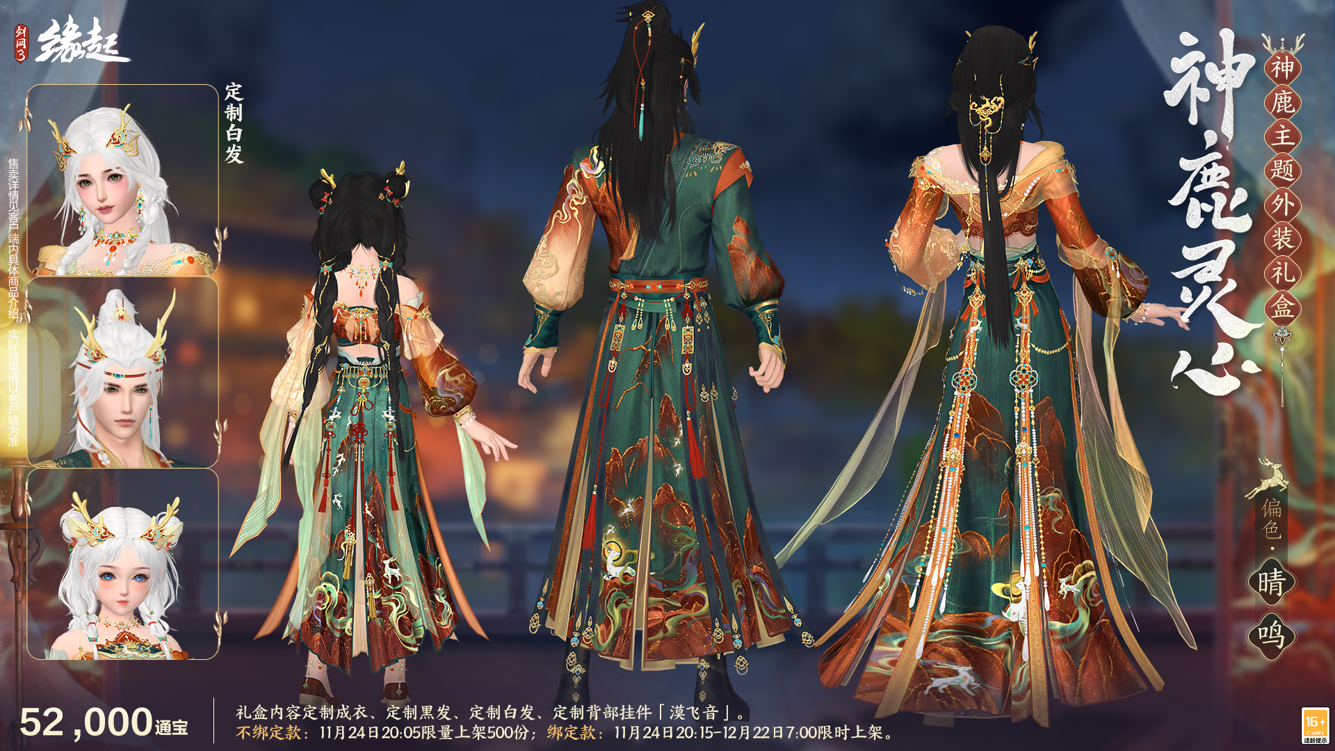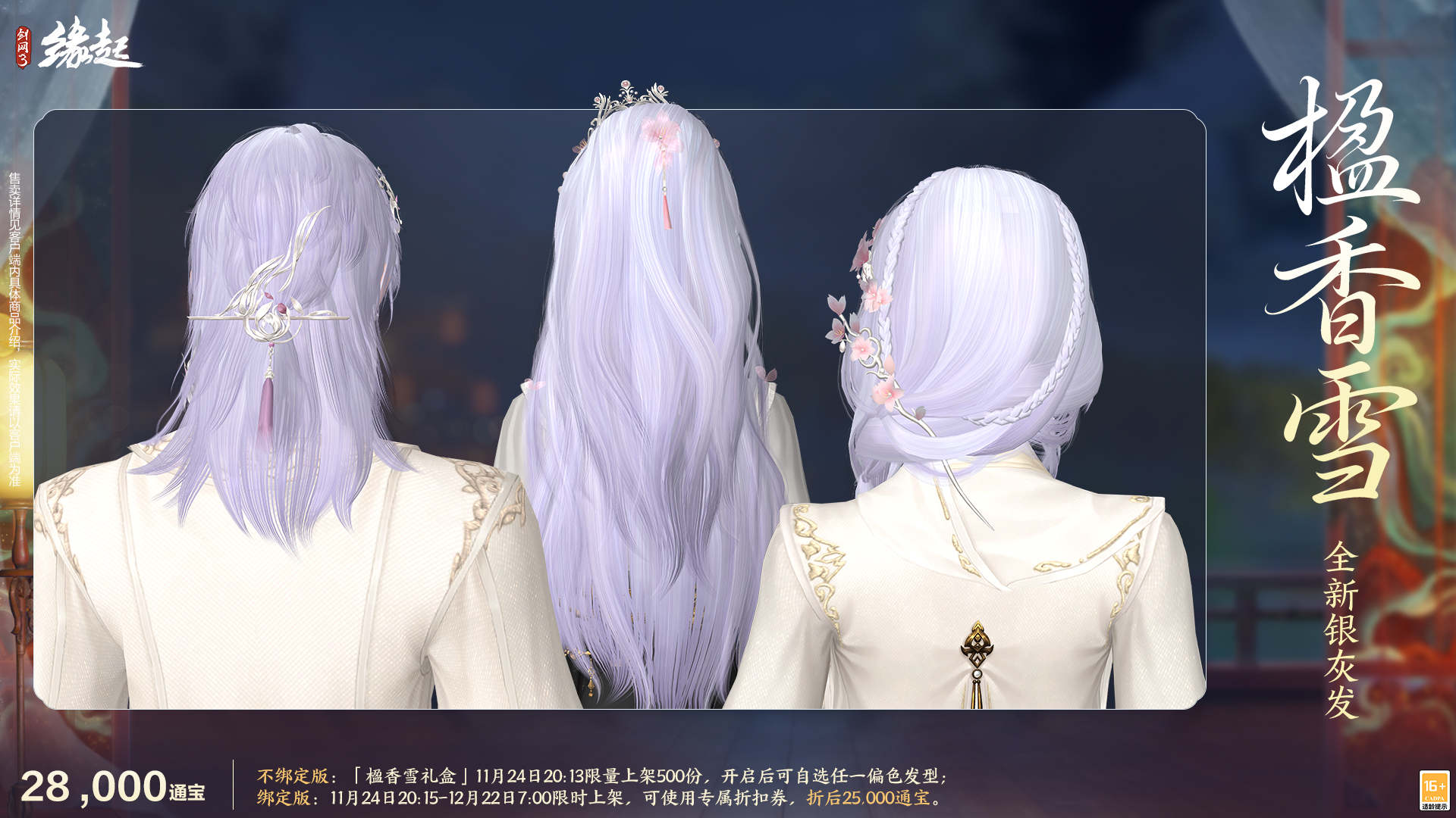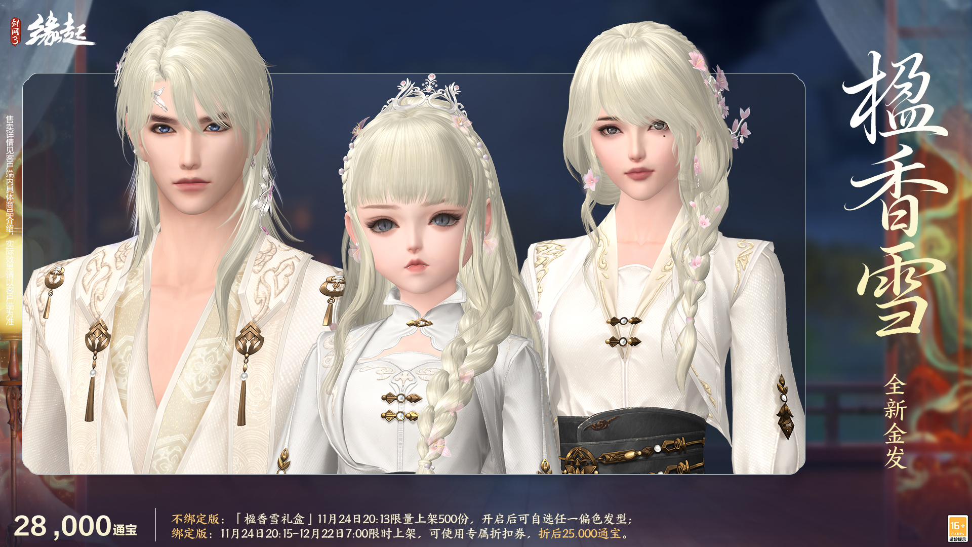玉絮倾入户,素手绘新颜,无尽气韵生。冬日换新衣,《剑网3缘起》商城新衣携12月特惠活动登场,惊喜折扣券上线即领,捏脸半价活动助侠换新颜。三倍积分回馈,消费满赠烟花,更有全新礼盒「神鹿灵心」、全新银灰发「楹香雪」及同款金发、战国主题礼盒「扶云阙」、全新狐裘披风等精美外观上架,搭配折扣券购买价格更优惠!冬日美景更衬佳人,侠士快快前往选购心仪好物吧! 十二月特惠折扣活动 十二月超值特惠活动11月24日7:00上线,捏脸全场半价开启。多重好礼相赠,惊喜折扣券上线即领,购买指定外观价格直降! 捏脸半价/体型自定义半价活动开启,商城常驻发型九折,千面美颜轻松拥有! 焰火腾光,递与福运。经典烟花限时返场,欢迎侠士前往选购!单笔消费满100元可获得一份限时7天的绑定版烟花“真橙之心”! 充消好礼再度更新,三倍积分助力,最高档可解锁全新跟宠「小霹雳」。 神鹿主题外观礼盒「神鹿灵心」 壁间斑驳绘仙踪,九色祥瑞焕古容。全新神鹿主题外观礼盒「神鹿灵心」犹如壁上画卷忽作人间显现,流光溢彩。 外观蕴含神鹿的灵动,九色神鹿的幻影与层叠的山峦云海交织成图,祥瑞之气随衣袂翩跹而生。发髻皆饰以金角,玲珑精致,如梦似幻。 成男款领口宽阔,斜襟交叠,正青色袍身铺陈山林远黛,祥云缭绕,其间赤色金纹勾勒出奔腾神鹿之影,更添灼灼生气。行至裙摆处,祥瑞云波缠绵,金光流转,似有仙气氤氲。 成女款绘以赤金云纹,层层裙摆内衬莹白轻纱,轻柔曼妙。裙身层叠铺展,裙摆绘就壁画般山石云纹与神鹿图样,色泽浓郁。珠串与玲珑玉饰垂于身侧,步态轻盈。 萝莉款两侧各绾一稚嫩发髻,以小巧金鹿角点缀,更显娇俏。上襦裁剪小巧,饰以金云纹绣。袖身轻软,金纱蓬松,行动之间轻盈若舞。 外观特效开启后,指尖蝴蝶翩翩起舞,忽有仙鹿现身,其身皎如明月,鹿角晶莹似玉,身披三色缎带,尾生碧水流霞,璀璨耀眼,至纯至善。 售卖信息: 售价52,000通宝。 不绑定版礼盒11月24日20:05限量上架500份,开启后可自选任一偏色礼盒; 绑定版礼盒11月24日20:15-12月22日7:00限时上架。 狐裘披风「玉振天音」、「夜烬无声」 新款狐狸毛披风来啦!形如狐尾,雍容华贵,白款披风「玉振天音」同黑款「夜烬无声」登场! 「玉振天音」皓然若月华凝霜,清澈如玉盘新雪。以皑皑狐羽堆叠,其质地丰厚而舒展,自生华贵。披风尾部,长尾逶迤而下,宛如琼枝带雪,曳地三尺,行止间,尽显九重天阙之雍容。 「夜烬无声」玄墨之色凝重如铁壁巍然。以乌金狐毛织就,其羽层叠,厚重如山,蕴藏无尽威仪。长裾曳地,内衬浮金暗绣,隐于墨色之下,如烛火微燃。墨绒堆砌,似深云蔽月,又如玄鸟展翅,不见其形,唯感尊贵之息。 售卖信息: 售价68,800通宝。 不绑定版「天音·无声」礼盒11月24日20:07限量上架300份,开启后可自选任一偏色披风; 绑定版披风11月24日20:15-12月22日7:00限时上架。 战国主题衍生外装「扶云阙」 墨发盘,朱丝扣;玉佩响,珠翠缀。全新战国主题衍生外装「扶云阙」11月24日上线。 此系列服饰深衣广袖,层叠交错,衣身绣以回纹、云纹及腾龙纹样,其金线熠熠,彰显古时袍服的雅韵。腰间束以层层衣带,皆以金玉珠翠点缀,与衣衫相得益彰。 成男款领口宽松,领边以异色宽带镶嵌,其上勾勒金线云雷纹,彰显气魄。腰间束一宽厚腰封,环绕朱红丝带,于左侧系扣,自腰身垂下青绿玉佩与长串朱红流苏,随风摇曳。 成女款乌发如瀑,尽数盘于脑后。发顶正中高绾一盘旋发髻,饱满而端雅。裙裾曳地,重叠交错,极富层次感。前襟开合间,金线细纹尽显典雅雍容。 萝莉款耳畔垂挂珍珠翠玉,玲珑典雅。尺寸合体,行动轻盈。衣身刺绣金色图案,细密而生动,腰间悬挂青绿玉佩与朱红流苏,更显别致。 售卖信息: 豪华版礼盒内含成衣+定制黑发+定制白发,售价38,000通宝,不绑定款11月24日20:09限量上架500份。 标准版礼盒内含成衣+定制黑发,售价28,000通宝,不绑定款11月24日20:11限量上架500份。 两版礼盒绑定款将于11月24日20:15-12月22日7:00限时上架。 全新银灰发楹香雪及同款金发 楹扉初雪染,疏梅缀银丝。全新银灰发「楹香雪」与同款金发以清雅绝尘之风,融汇冰雪与春华。配套动态头像框同步上架。 发型以楹间凝雪为意,香风漫拂,巧绣春妍。发型各异其趣,或披肩,或编辫,皆萦绕淡雅花意,缀以细碎梅瓣,遥承“楹香雪”之清绝意蕴。 成男款两鬓碎发拂过耳畔,自然垂落肩头,脑后发丝拢束,未曾系缚,任其自由披散,层次分明,尽显不羁之姿。光泽流转间,饱含初冬之雪的凛然之气。 成女款柔顺的刘海斜过眉眼,不掩灵动之姿。头顶发丝舒卷绵延,拢至一侧秀肩,编为蓬松长辫,蜿蜒而下,交织数朵娇俏粉梅,花瓣玲珑,错落其间,似早春寒梅点点,温婉而雅。 萝莉款齐整的短刘海覆于眉上,更衬双眸清澈。长发编织为垂至前胸的粗辫,辫体紧密,线条流畅。发端正中,戴有一顶华美冠饰,其上珠贝点缀,晶莹剔透,熠熠生辉。 售卖信息: 发型售价28,000通宝。 不绑定版「楹香雪礼盒」11月24日20:13限量上架500份,开启后可自选任一偏色发型; 绑定版11月24日20:15-12月22日7:00限时上架,可使用专属折扣券,折后25,000通宝。 头像框售价15,000通宝,均为不绑定款 11月24日20:15-12月22日7:00限时上架,可使用专属折扣券,折后13,200通宝。 月度限定外观捕风捉影 朔风猎猎明月钩,飞檐走壁觅踪由。月度限定外观「捕风捉影」六款偏色11月24