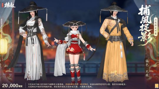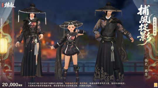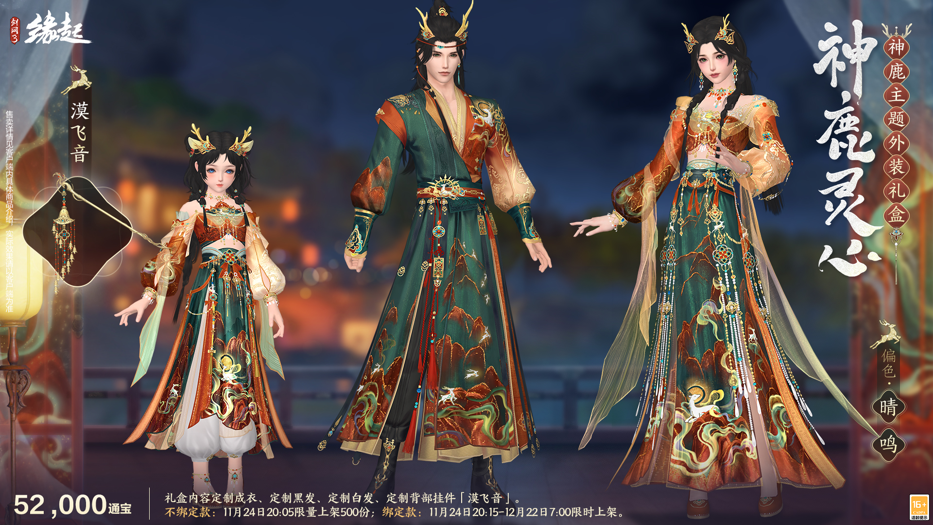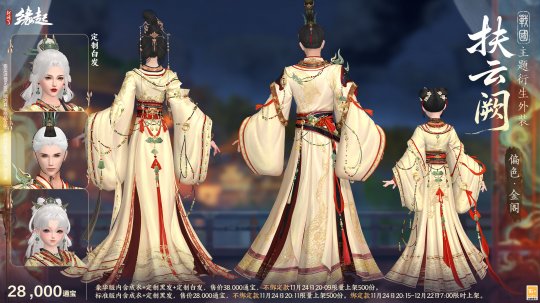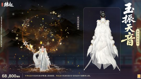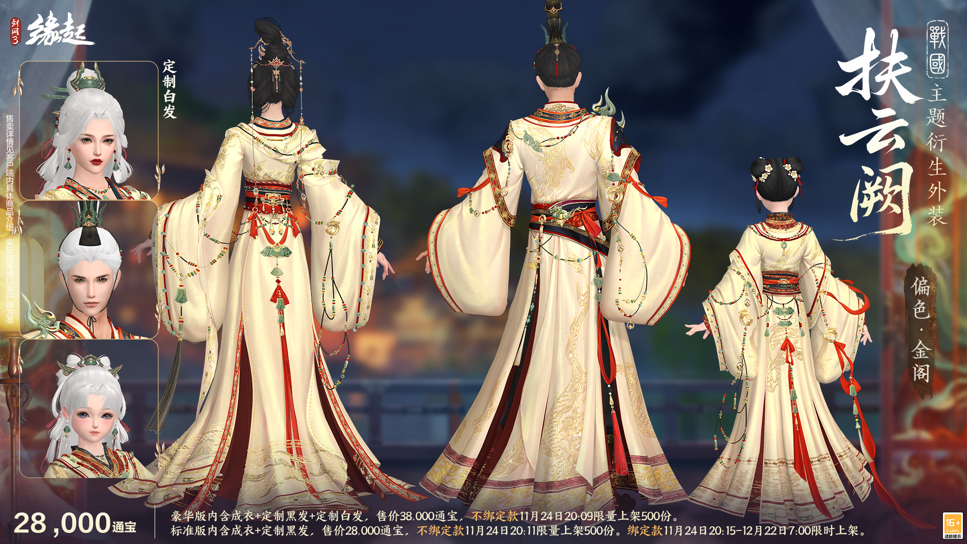 玉絮倾入户,素手绘新颜,无尽气韵生。冬日换新衣,《剑网3缘起》商城新衣携12月特惠活动登场,惊喜折扣券上线即领,捏脸半价活动助侠换新颜。三倍积分回馈,消费满赠烟花,更有全新礼盒「神鹿灵心」、全新银灰发「楹香雪」及同款金发、战国主题礼盒「扶云阙」、全新狐裘披风等精美外观上架,搭配折扣券购买价格更优惠!冬日美景更衬佳人,侠士快快前往选购心仪好物吧! 十二月特惠折扣活动 十二月超值特惠活动11月24日7:00上线,捏脸全场半价开启。多重好礼相赠,惊喜折扣券上线即领,购买指定外观价格直降! 捏脸半价/体型自定义半价活动开启,商城常驻发型九折,千面美颜轻松拥有! 焰火腾光,递与福运。经典烟花限时返场,欢迎侠士前往选购!单笔消费满100元可获得一份限时7天的绑定版烟花“真橙之心”! 充消好礼再度更新,三倍积分助力,最高档可解锁全新跟宠「小霹雳」。 神鹿主题外观礼盒「神鹿灵心」 壁间斑驳绘仙踪,九色祥瑞焕古容。全新神鹿主题外观礼盒「神鹿灵心」犹如壁上画卷忽作人间显现,流光溢彩。 外观蕴含神鹿的灵动,九色神鹿的幻影与层叠的山峦云海交织成图,祥瑞之气随衣袂翩跹而生。发髻皆饰以金角,玲珑精致,如梦似幻。 成男款领口宽阔,斜襟交叠,正青色袍身铺陈山林远黛,祥云缭绕,其间赤色金纹勾勒出奔腾神鹿之影,更添灼灼生气。行至裙摆处,祥瑞云波缠绵,金光流转,似有仙气氤氲。 成女款绘以赤金云纹,层层裙摆内衬莹白轻纱,轻柔曼妙。裙身层叠铺展,裙摆绘就壁画般山石云纹与神鹿图样,色泽浓郁。珠串与玲珑玉饰垂于身侧,步态轻盈。 萝莉款两侧各绾一稚嫩发髻,以小巧金鹿角点缀,更显娇俏。上襦裁剪小巧,饰以金云纹绣。袖身轻软,金纱蓬松,行动之间轻盈若舞。 外观特效开启后,指尖蝴蝶翩翩起舞,忽有仙鹿现身,其身皎如明月,鹿角晶莹似玉,身披三色缎带,尾生碧水流霞,璀璨耀眼,至纯至善。 售卖信息: 售价52,000通宝。 不绑定版礼盒11月24日20:05限量上架500份,开启后可自选任一偏色礼盒; 绑定版礼盒11月24日20:15-12月22日7:00限时上架。 狐裘披风「玉振天音」、「夜烬无声」 新款狐狸毛披风来啦!形如狐尾,雍容华贵,白款披风「玉振天音」同黑款「夜烬无声」登场! 「玉振天音」皓然若月华凝霜,清澈如玉盘新雪。以皑皑狐羽堆叠,其质地丰厚而舒展,自生华贵。披风尾部,长尾逶迤而下,宛如琼枝带雪,曳地三尺,行止间,尽显九重天阙之雍容。 「夜烬无声」玄墨之色凝重如铁壁巍然。以乌金狐毛织就,其羽层叠,厚重如山,蕴藏无尽威仪。长裾曳地,内衬浮金暗绣,隐于墨色之下,如烛火微燃。墨绒堆砌,似深云蔽月,又如玄鸟展翅,不见其形,唯感尊贵之息。 售卖信息: 售价68,800通宝。 不绑定版「天音·无声」礼盒11月24日20:07限量上架300份,开启后可自选任一偏色披风; 绑定版披风11月24日20:15-12月22日7:00限时上架。 战国主题衍生外装「扶云阙」 墨发盘,朱丝扣;玉佩响,珠翠缀。全新战国主题衍生外装「扶云阙」11月24日上线。 此系列服饰深衣广袖,层叠交错,衣身绣以回纹、云纹及腾龙纹样,其金线熠熠,彰显古时袍服的雅韵。腰间束以层层衣带,皆以金玉珠翠点缀,与衣衫相得益彰。 成男款领口宽松,领边以异色宽带镶嵌,其上勾勒金线云雷纹,彰显气魄。腰间束一宽厚腰封,环绕朱红丝带,于左侧系扣,自腰身垂下青绿玉佩与长串朱红流苏,随风摇曳。 成女款乌发如瀑,尽数盘于脑后。发顶正中高绾一盘旋发髻,饱满而端雅。裙裾曳地,重叠交错,极富层次感。前襟开合间,金线细纹尽显典雅雍容。 萝莉款耳畔垂挂珍珠翠玉,玲珑典雅。尺寸合体,行动轻盈。衣身刺绣金色图案,细密而生动,腰间悬挂青绿玉佩与朱红流苏,更显别致。 售卖信息: 豪华版礼盒内含成衣+定制黑发+定制白发,售价38,000通宝,不绑定款11月24日20:09限量上架500份。 标准版礼盒内含成衣+定制黑发,售价28,000通宝,不绑定款11月24日20:11限量上架500份。 两版礼盒绑定款将于11月24日20:15-12月22日7:00限时上架。 全新银灰发楹香雪及同款金发 楹扉初雪染,疏梅缀银丝。全新银灰发「楹香雪」与同款金发以清雅绝尘之风,融汇冰雪与春华。配套动态头像框同步上架。 发型以楹间凝雪为意,香风漫拂,巧绣春妍。发型各异其趣,或披肩,或编辫,皆萦绕淡雅花意,缀以细碎梅瓣,遥承“楹香雪”之清绝意蕴。 成男款两鬓碎发拂过耳畔,自然垂落肩头,脑后发丝拢束,未曾系缚,任其自由披散,层次分明,尽显不羁之姿。光泽流转间,饱含初冬之雪的凛然之气。 成女款柔顺的刘海斜过眉眼,不掩灵动之姿。头顶发丝舒卷绵延,拢至一侧秀肩,编为蓬松长辫,蜿蜒而下,交织数朵娇俏粉梅,花瓣玲珑,错落其间,似早春寒梅点点,温婉而雅。 萝莉款齐整的短刘海覆于眉上,更衬双眸清澈。长发编织为垂至前胸的粗辫,辫体紧密,线条流畅。发端正中,戴有一顶华美冠饰,其上珠贝点缀,晶莹剔透,熠熠生辉。 售卖信息: 发型售价28,000通宝。 不绑定版「楹香雪礼盒」11月24日20:13限量上架500份,开启后可自选任一偏色发型; 绑定版11月24日20:15-12月22日7:00限时上架,可使用专属折扣券,折后25,000通宝。 头像框售价15,000通宝,均为不绑定款 11月24日20:15-12月22日7:00限时上架,可使用专属折扣券,折后13,200通宝。 月度限定外观捕风捉影 朔风猎猎明月钩,飞檐走壁觅踪由。月度限定外观「捕风捉影」六款偏色11月24