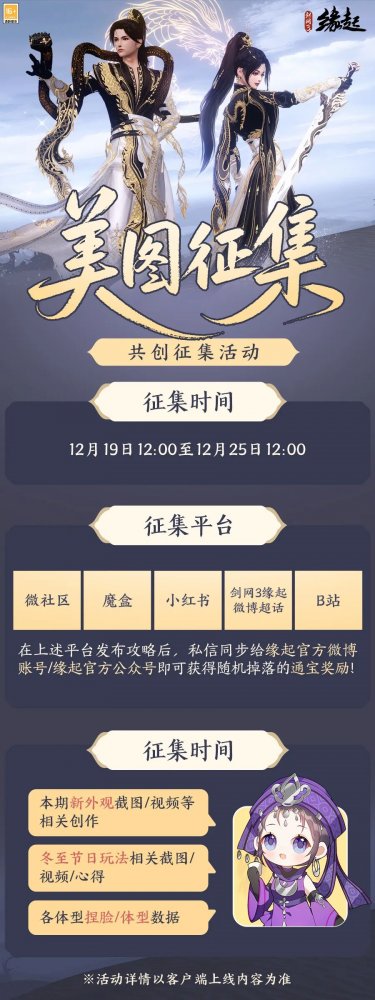 冬至新衣已上架商城, 欢迎侠士前往选购! 新一期截图创作征集开启, 有爱太太前往指定平台进行创作, 即有机会获得通宝奖励! 活动详情