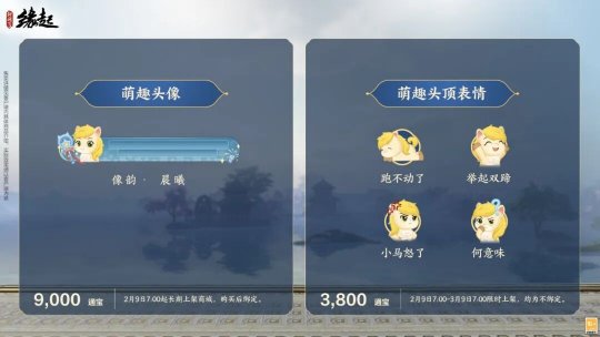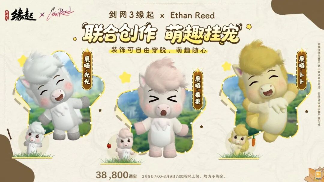 当可爱踏入大唐,江湖的飒爽和童心的烂漫融合出鲜活生机!《剑网3缘起》× Ethan Reed 联合打造的萌趣挂宠软萌治愈,蓬松的鬃毛带着温暖柔和的质感,搭配灵动的神态,多变表情时刻传递着欢快氛围,蹦跳玩耍间,将「晨曦」的萌趣尽数展现。 和「晨曦」相伴同行,它会安静跟在侠士身边,侠士还可以解锁多样趣味互动,环绕奏响轻快的曲调,或是歪头撒娇,也会绕着侠士轻快跑动,亲昵十足,将轻松和治愈带给每一位侠士。 售卖信息: 售价38,800通宝, 2月9日7:00-3月9日7:00限时上架,均为不绑定款。 贰「像韵·晨曦」、萌趣头顶表情 马年添萌趣!「像韵?晨曦」以软萌金发小马搭配通透蓝框,清新治愈;四款头顶表情憨态尽显,精准戳中侠士的表情包需求。新年焕新颜,速来用表情包解锁新的奇趣体验! 「像韵 晨曦」售卖信息: 售价9,000通宝 2月9日7:00起长期上架,购买后绑定。 头顶表情售卖信息: 售价3,600通宝 2月9日7:00-3月9日7:00限时上架,均为不绑定。 |