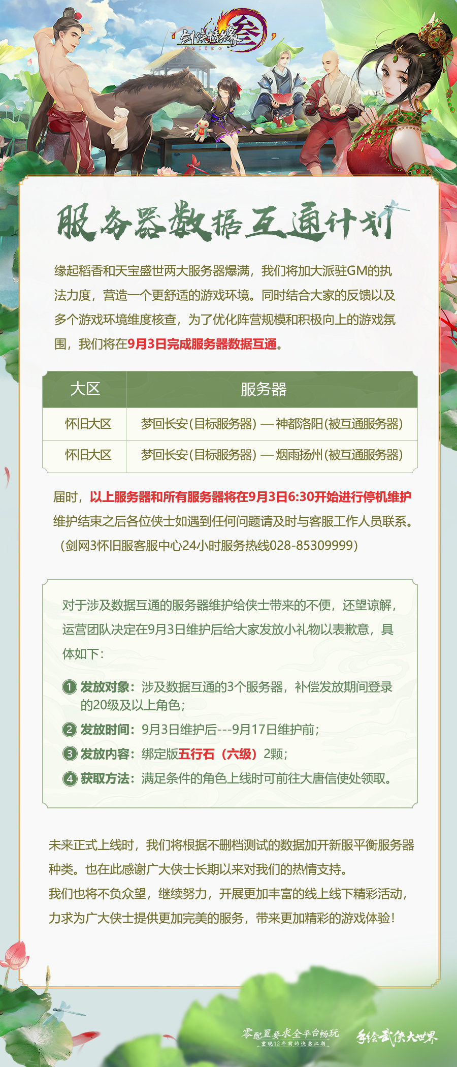 《剑网3》怀旧服上线全网上线已近一个月,缘起稻香、天宝盛世两大服务器日日爆满,阵营攻防更是十分激烈,千人鏖战尽显热血江湖!但研发团队也注意到,部分服务器存在阵营势力过于悬殊的问题,为了优化阵营规模和保持积极向上的游戏氛围,经过严谨的探讨和对多个游戏环境维度的核查,《剑网3》怀旧服将于9月3日6:30对【梦回长安】【神都洛阳】【烟雨扬州】三个服务器进行数据互通。同时,为了营造一个更为舒适的游戏环境,派驻GM的执法力度将继续加大,“大唐巡捕”将持续对工作室和线下金团进行打击,也欢迎侠士在游戏内对工作室账号进行举报,和谐有爱的大唐盛世由你我共创!