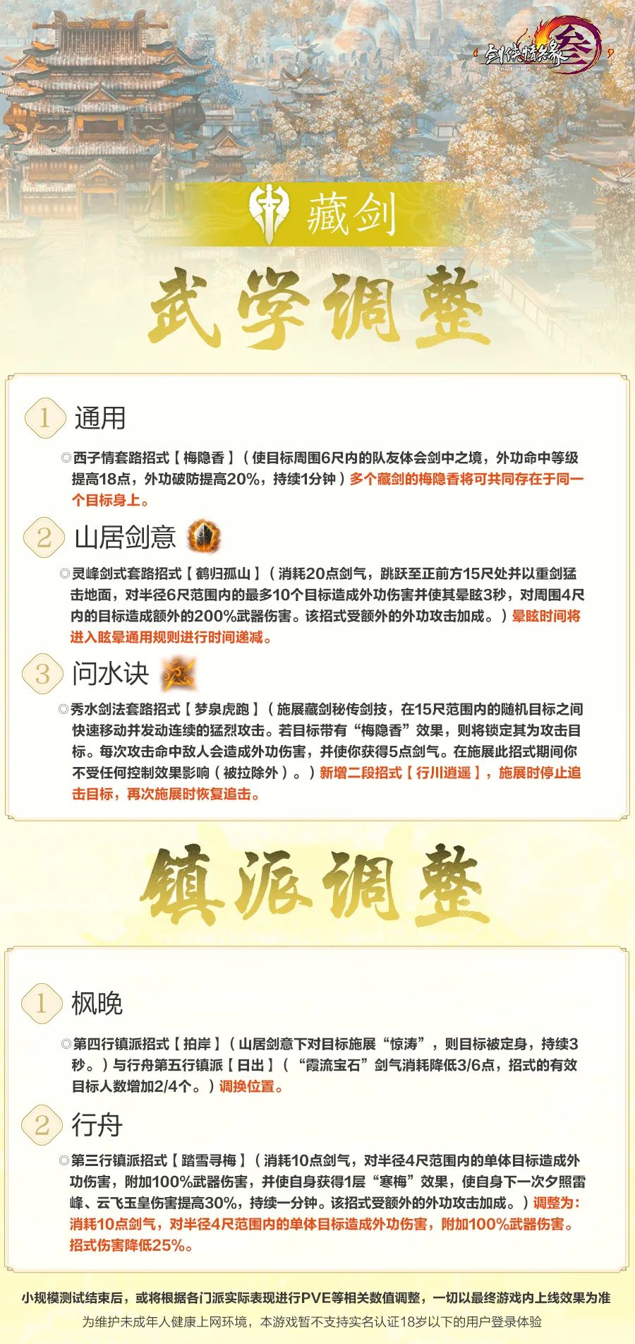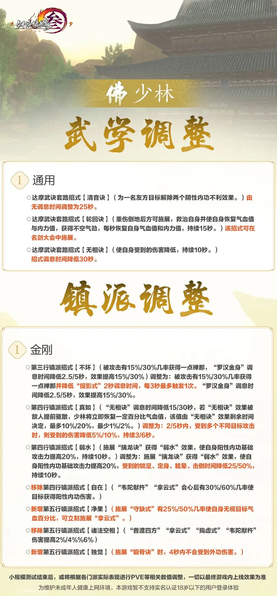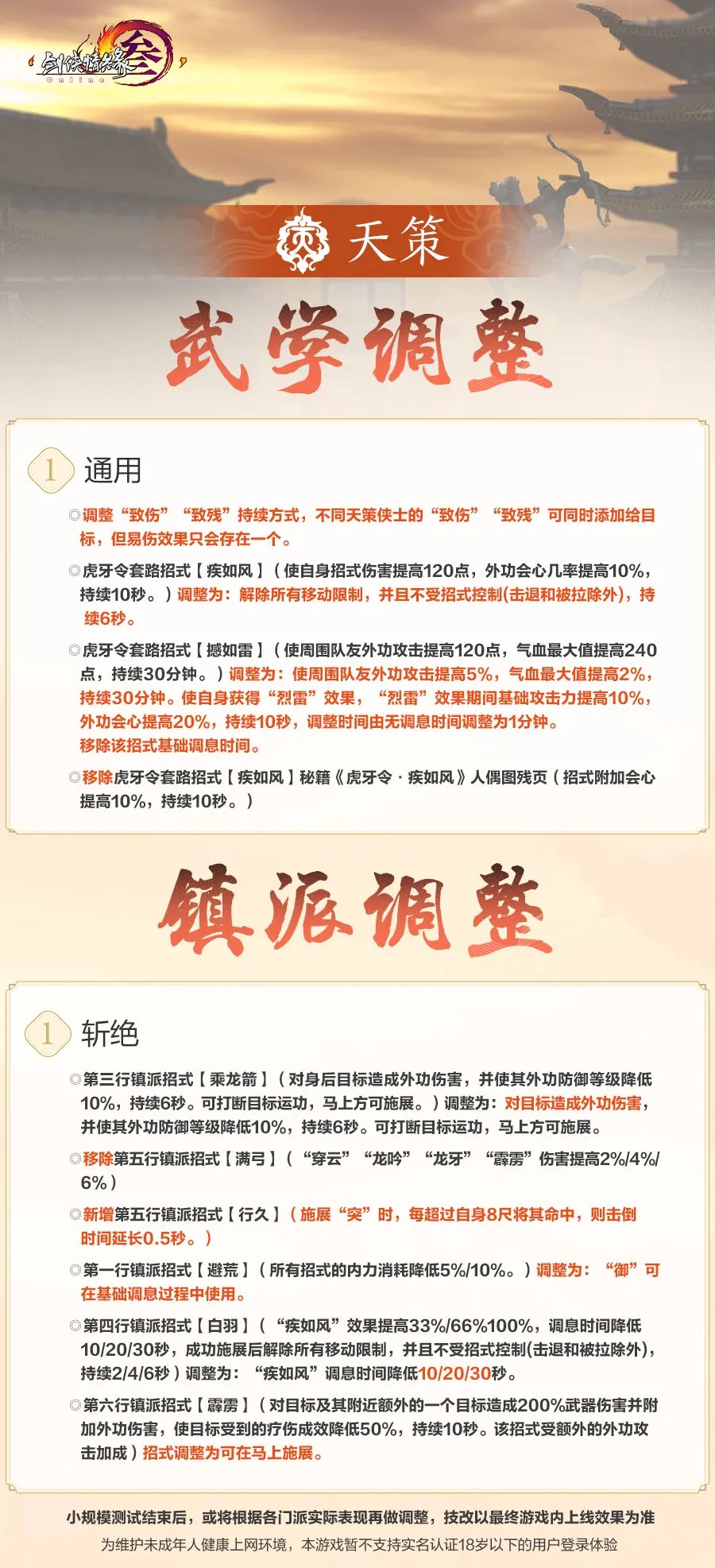 ?(?)?号外号外,今日大唐资讯早、诶,没有早报?等等,这一叠资料是……来,看看小九整理出来的最新情报! 据隐元会消息,近日,首届六大门派武学研讨会顺利进行。全门派武学技能及镇派将有所调整,此次调整将对各位侠士行走江湖产生密切影响,还请诸位仔细阅读并勤加练习~ 武学/镇派调整 测试结束后,或将根据各门派实际表现进行PVE等相关数值调整,一切以最终游戏内上线效果为准。 小九贴士: ①3月11日将开启小规模测试,可抢先体验调整内容,欢迎大家参与体验,游戏内点击shift+h即可进行反馈! ②点击文章末尾的【阅读原文】传送官网,今天下午15:00将在该页面更新体验服客户端下载地址。 以上就是关于剑网3怀旧服门派改动全部内容,想了解更多门派资讯,请关注叶子猪剑网3怀旧服官方合作专区。 |