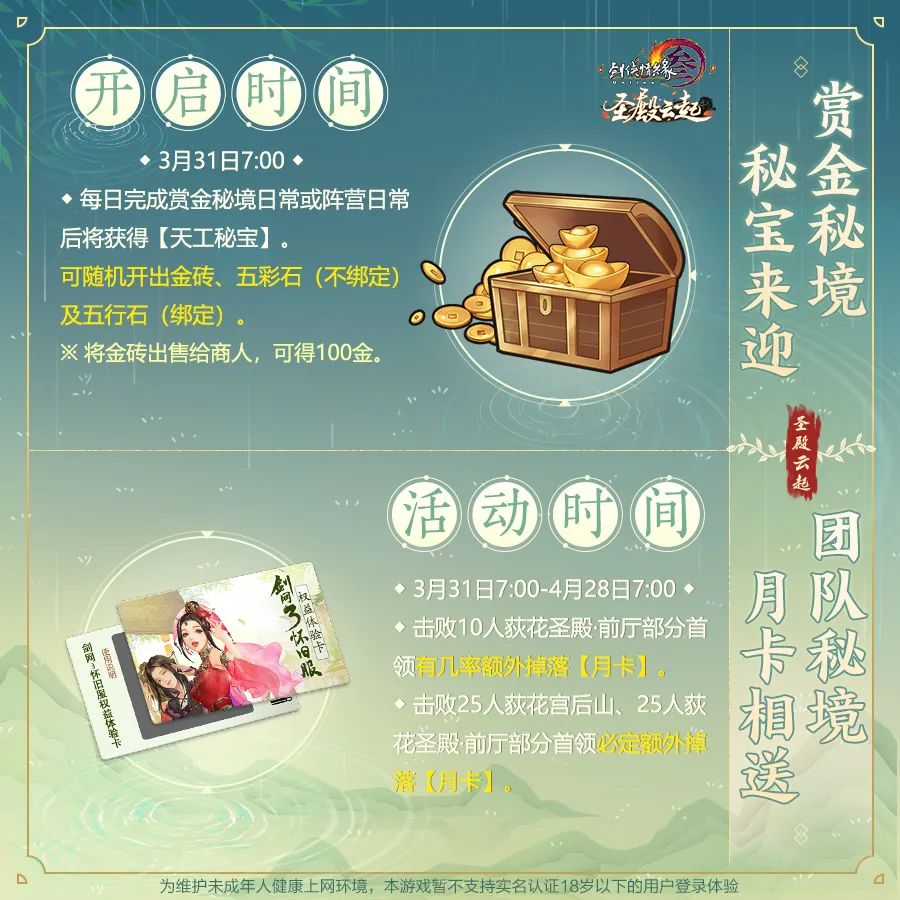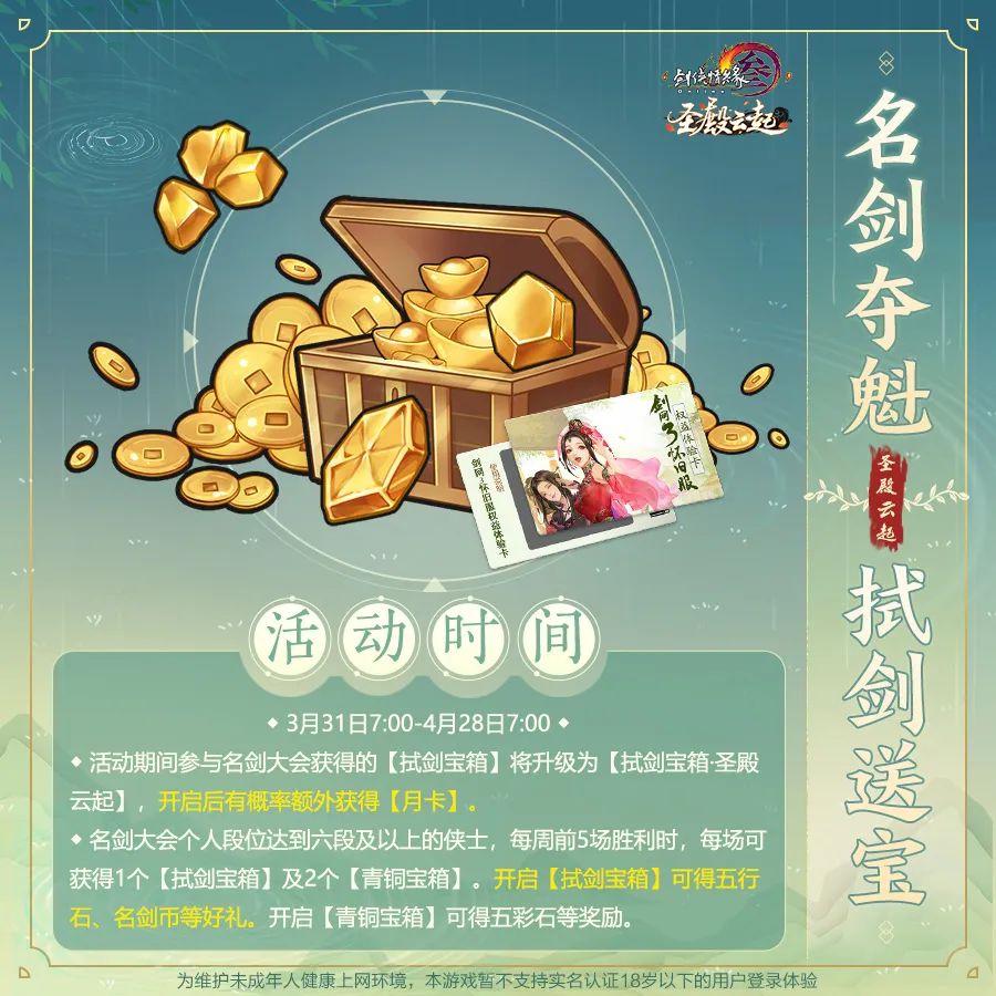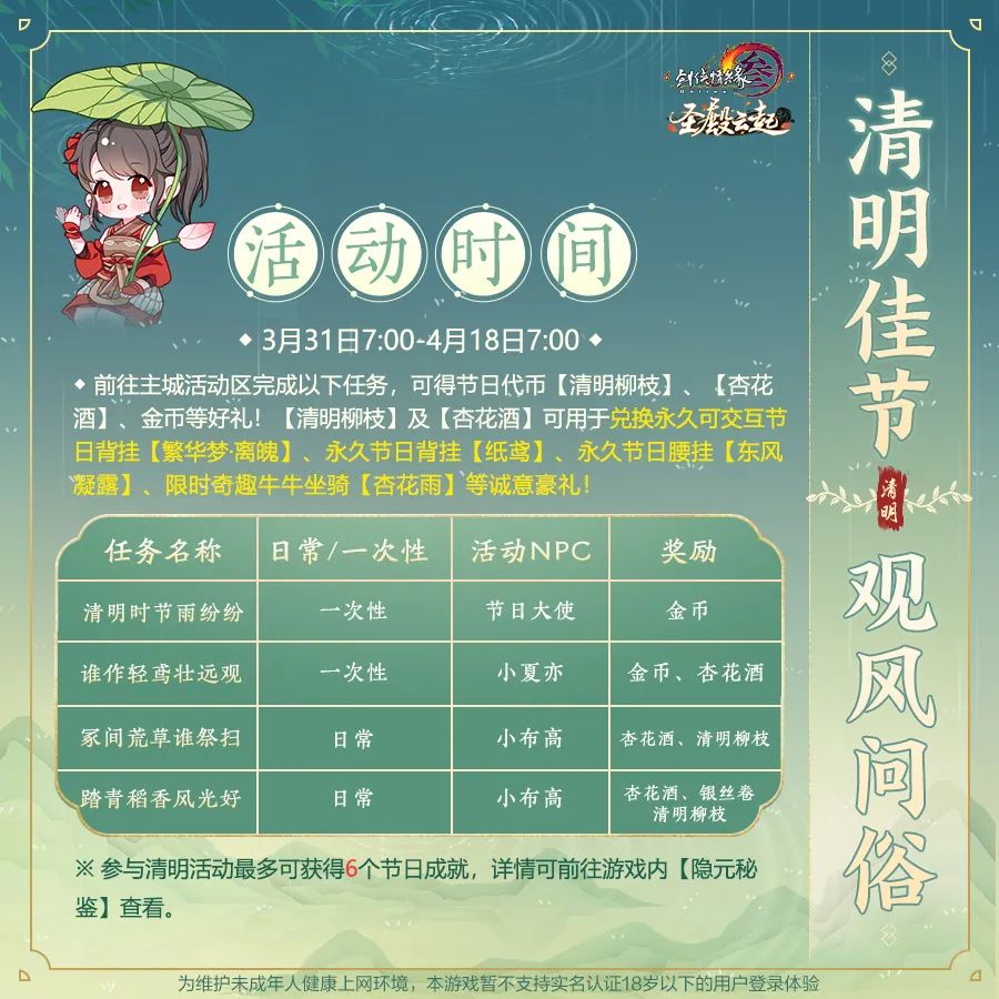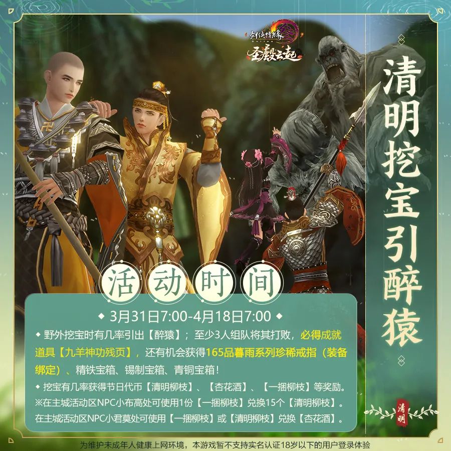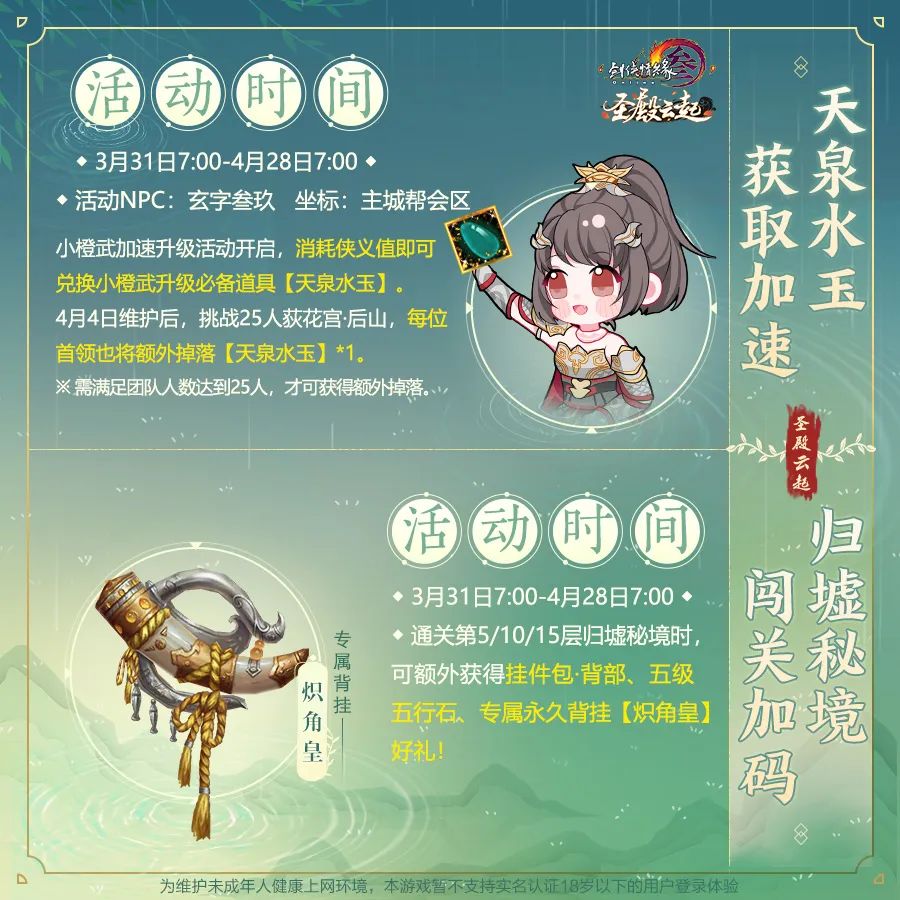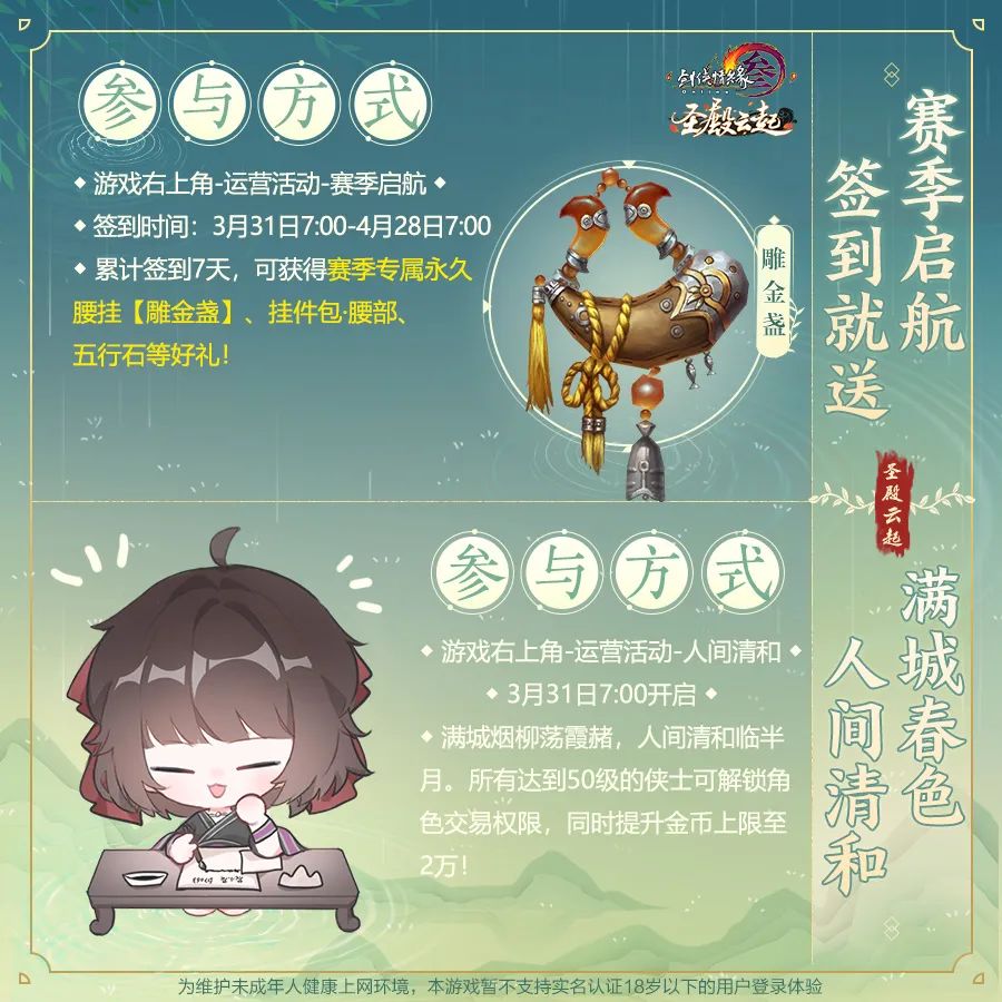 新赛季活动福利 3月31日新赛季圣殿云起开启!为助阵新赛季,3月31日7:00起,诸多福利惊喜上线啦?( ? )? 别再观望,累计签到就送赛季专属永久腰挂!勇闯归墟还有永久背挂等你来拿?ω?什么,挂件位不够?别担心,也为侠士准备了对应部位的挂件包~谁看了不夸一句贴心呢(疯狂暗示.jpg 为助力小橙武,天泉水玉获取加速!指定秘境可掉落,侠义值也能换噢~ 此外还有共战江湖增益加身、名剑大会宝箱及秘境首领额外月卡加码、完成指定日常可随机获得的金砖等好礼相赠,助侠士无畏挑战新赛季! ↓快点开大图查看详情吧↓ 清明节活动福利 春暮疏雨寒清明,佳节赠礼暖真心。3月31日7:00-4月18日7:00,前往主城活动区完成指定任务或前往野外挖宝,皆能获得活动代币兑换永久可交互背挂、永久节日背挂/腰挂和限时奇趣坐骑! 小九贴士:挖宝必得成就道具!还有机会获得165品珍稀戒指等好礼哟~ ↓快点开大图查看详情吧↓ 更多官方活动资讯,请关注叶子猪剑网3怀旧服官方合作专区。 |