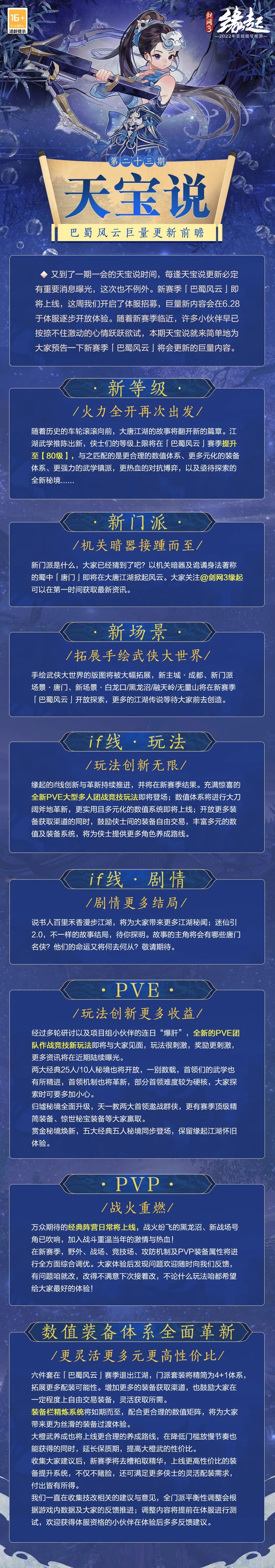 新赛季即将开启,6月28日体验服也将正式和大家见面,在体服招募如火如荼进行之际,大家是不是已经迫不及待想进入新赛季啦? 今天缘起娘为大家带来新一期的《天宝说》,新等级、新门派、if线、更丰富的玩法改造...巨量内容,快来一睹为快~ 后续内容,请关注叶子猪剑网3怀旧服官方合作专区。 |
