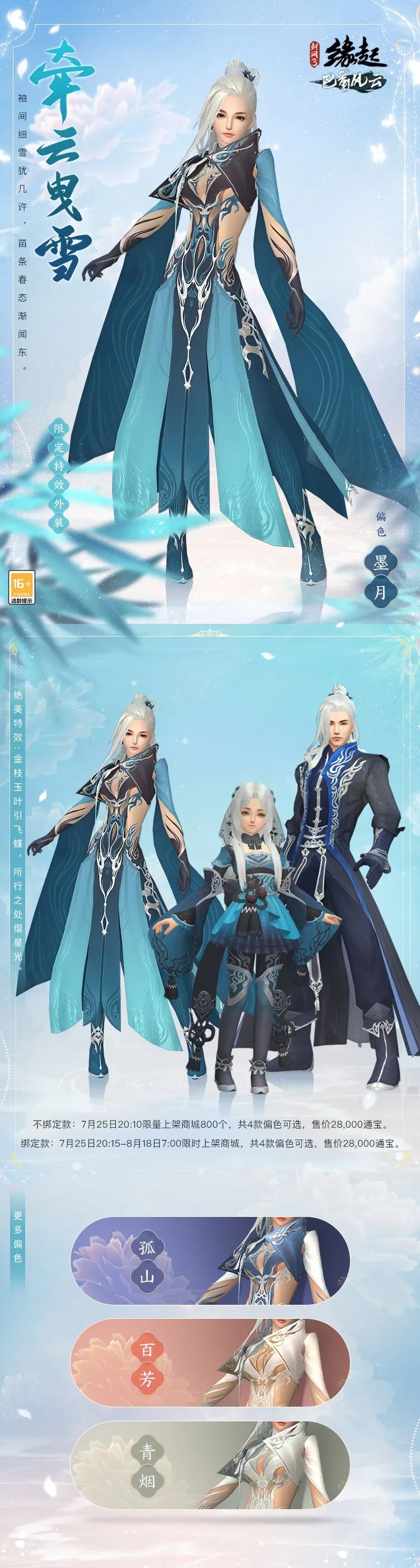 今天《剑网3缘起》更新了1.0.0.2499版本,另外据官方消息新资料片“巴蜀风云”7月28日就要上线了,我们先来看看本次的更新内容以及新资料片的先行爆料吧! 【更新内容】 ◎ 数据互通 1、综合 ·为了营造一个更舒适的游戏环境,结合侠士的反馈及多个游戏环境维度核查,运营团队计划在2022年7月21日6:30对【缘起稻香(目标服务器)】【梦回长安(被互通服务器)】【天下问鼎(被互通服务器)】进行服务器数据互通工作,以营造更好的游戏氛围。数据互通预计结束时间为12:00,如遇特殊情况将会顺延。 ※本次数据互通服务器可享受限时福利,短期内可支持同一服务器内超过9个角色共享行商令权益,福利时间结束前将通过游戏公告通知各位侠士,届时请侠士留意公告,并根据相应规则处理超出限制的角色 ·请涉及数据互通服务器的所有侠士认真查看数据互通规则(详情见官网公告), 并随时关注官方最新公告,如遇到任何问题请及时与客服工作人员联系。 2、数据互通补偿 ·对于涉及数据互通的服务器维护给侠士带来的不便,还望谅解。7月21日维护后至8月4日维护前,数据互通所涉及的服务器(缘起稻香、梦回长安、天下问鼎)20级及以上角色登录游戏后,可前往大唐信使处领取2颗绑定版五行石(六级)。 《剑网3缘起》新资料片「巴蜀风云」公测定档7月28日 异域外装礼盒「浮光黛月」/首款特效外观「牵云曳雪」、飒爽月限「策马弯弓」/精美成衣「洗尘寰」于7月25日先行登场!更有激萌熊猫「挂宠·滚滚」7月29日与侠士相逢!多样佳品任君选,快来抢先一看上身展示吧~ 充消赠礼充消赠礼:7月25日7:00-8月18日7:00充消回馈第三档赠帐篷特效背挂「地舆天盖」,还有珍稀腰挂「翠羽惊凤」和背挂「雀扇半屏开」相送双倍积分:7月25日7:00-8月1日7:00 精美成衣「洗尘寰」 >>>一袭清衣尘不染,几许闲愁泛江南<<< 成女款飘渺长裙青丝及腰 成男款渐色素衣不染纤尘 萝莉款水色衣裙渐染皓白 上架详情 4款偏色7月25日7:00永久上架,绑定版,20,000通宝,首周9折配套绑定黑发同步永久上架,10,000通宝,首周9折 月度限定「策马弯弓」 >>>金钟满斟醉芊草,策马弯弓向碧霄<<< 成女款飒爽又添活泼成男款尽显豪放不羁萝莉款凸显自在本色上架详情 2款偏色7月25日7:00-8月18日7:00上架,绑定版,20,000通宝配套绑定黑发同步上架,绑定版,10,000通宝月度限定外观并非绝版外观,将在每年指定月份开放上架,以便侠士选购。 特效外观「牵云曳雪」 >>>袖间细雪犹几许,苗条春态渐闻东<<< 成女款翻领长袖恣意随性成男款玉树临风文武兼宜萝莉款银团墨纹繁复有序上架详情 4款偏色任君挑选,所行之处熠熠星光! 不绑定款:7月25日20:10限量上架800套,28,000通宝 绑定款:7月25日20:15-8月18日7:00限时上架,28,000通宝 更多《剑网3缘起》相关资讯,可以关注叶子猪的《剑网3缘起》官方合作专区 |